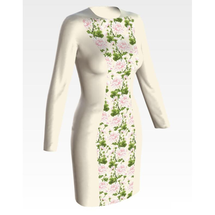 Заготовка для вишивки жіночої сукні Ніжні хризантеми призначена для часткової зашивки бісером або нитками. Схема надрукована на домотканому полотні бежевого кольору екологічно чистими стійкими фарбами, що не змиваються після прання. Відрізи розкроєні з урахуванням необхідних запасів для зручного вишивання та подальшого пошиття виробу.