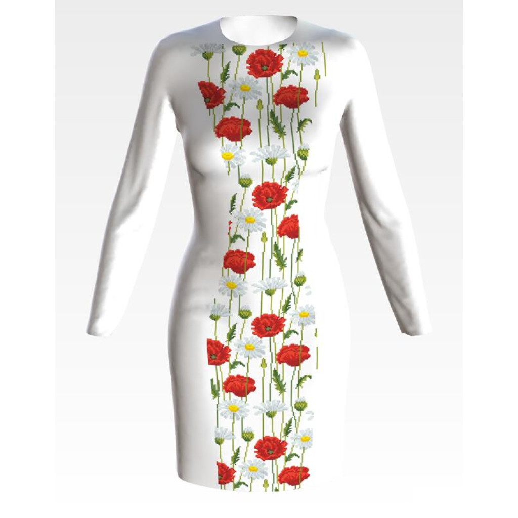 Заготовка для вишивки жіночої сукні Ромашки і маки призначена для часткової зашивки бісером або нитками. Схема надрукована на домотканому полотні білого кольору екологічно чистими стійкими фарбами, що не змиваються після прання. Відрізи розкроєні з урахуванням необхідних запасів для зручного вишивання та подальшого пошиття виробу.
