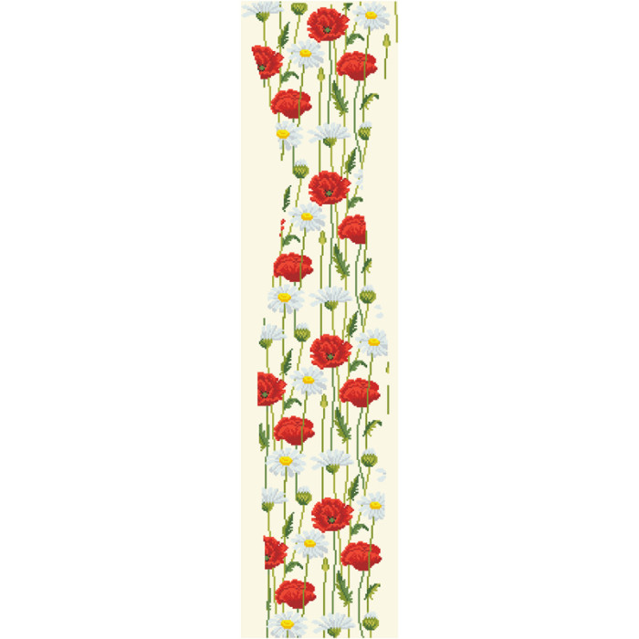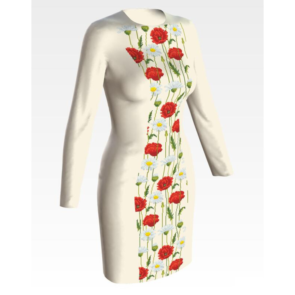 Заготовка для вишивки жіночої сукні Ромашки і маки призначена для часткової зашивки бісером або нитками. Схема надрукована на домотканому полотні бежевого кольору екологічно чистими стійкими фарбами, що не змиваються після прання. Відрізи розкроєні з урахуванням необхідних запасів для зручного вишивання та подальшого пошиття виробу.