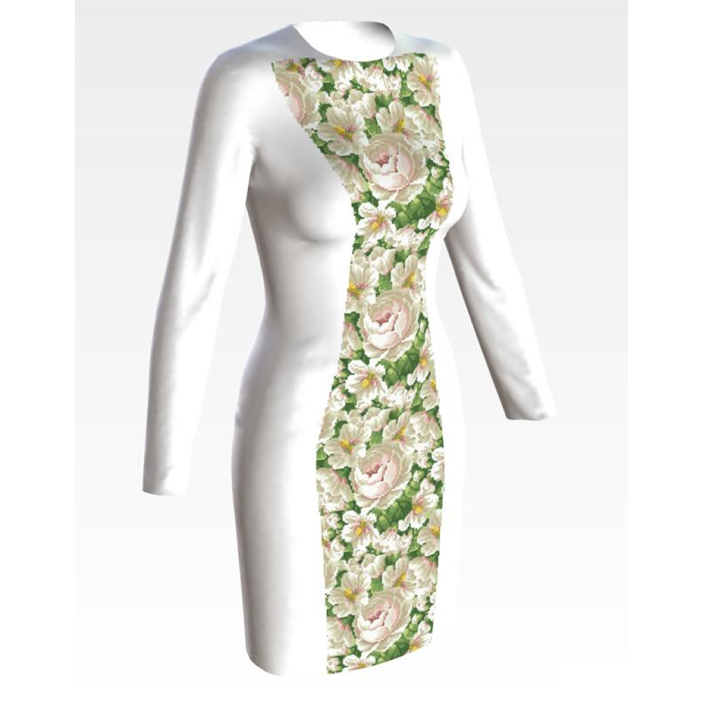 Заготовка для вишивки жіночої сукні Білі мальви і троянди призначена для часткової зашивки бісером або нитками. Схема надрукована на білому габардині екологічно чистими стійкими фарбами, що не змиваються після прання. Відрізи розкроєні з урахуванням необхідних запасів для зручного вишивання та подальшого пошиття виробу.