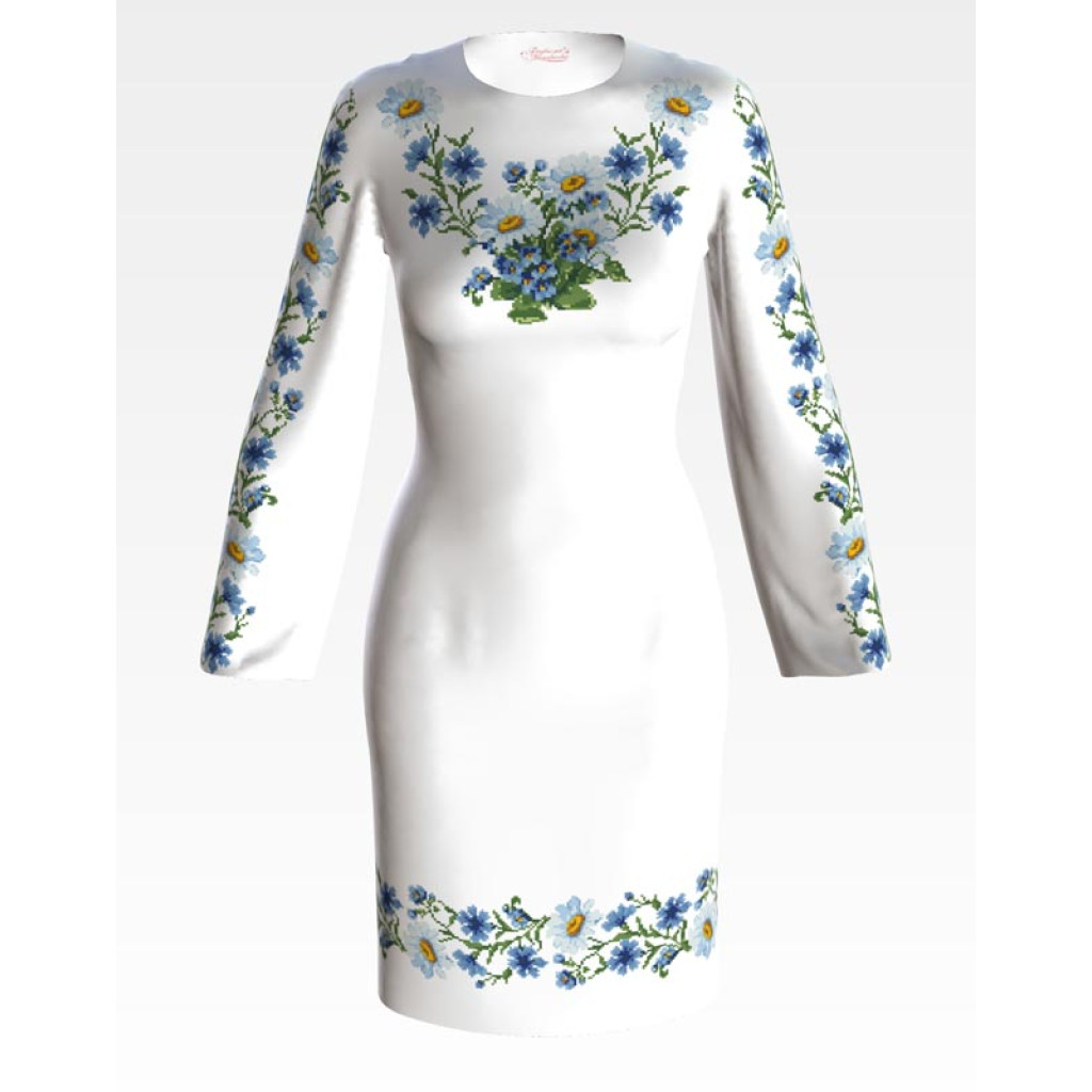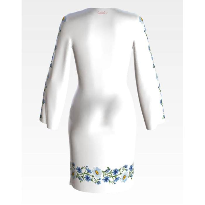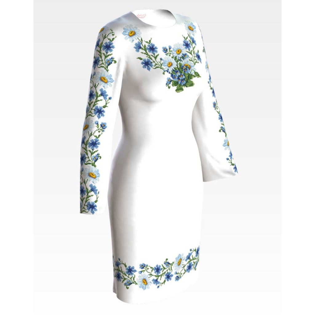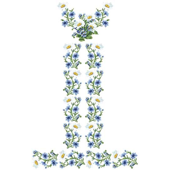 Заготовка для вишивки жіночої сукні Ромашки і волошки призначена для часткової зашивки бісером або нитками. Схема надрукована на льоні білого кольору екологічно чистими стійкими фарбами, що не змиваються після прання. Відрізи розкроєні з урахуванням необхідних запасів для зручного вишивання та подальшого пошиття виробу.