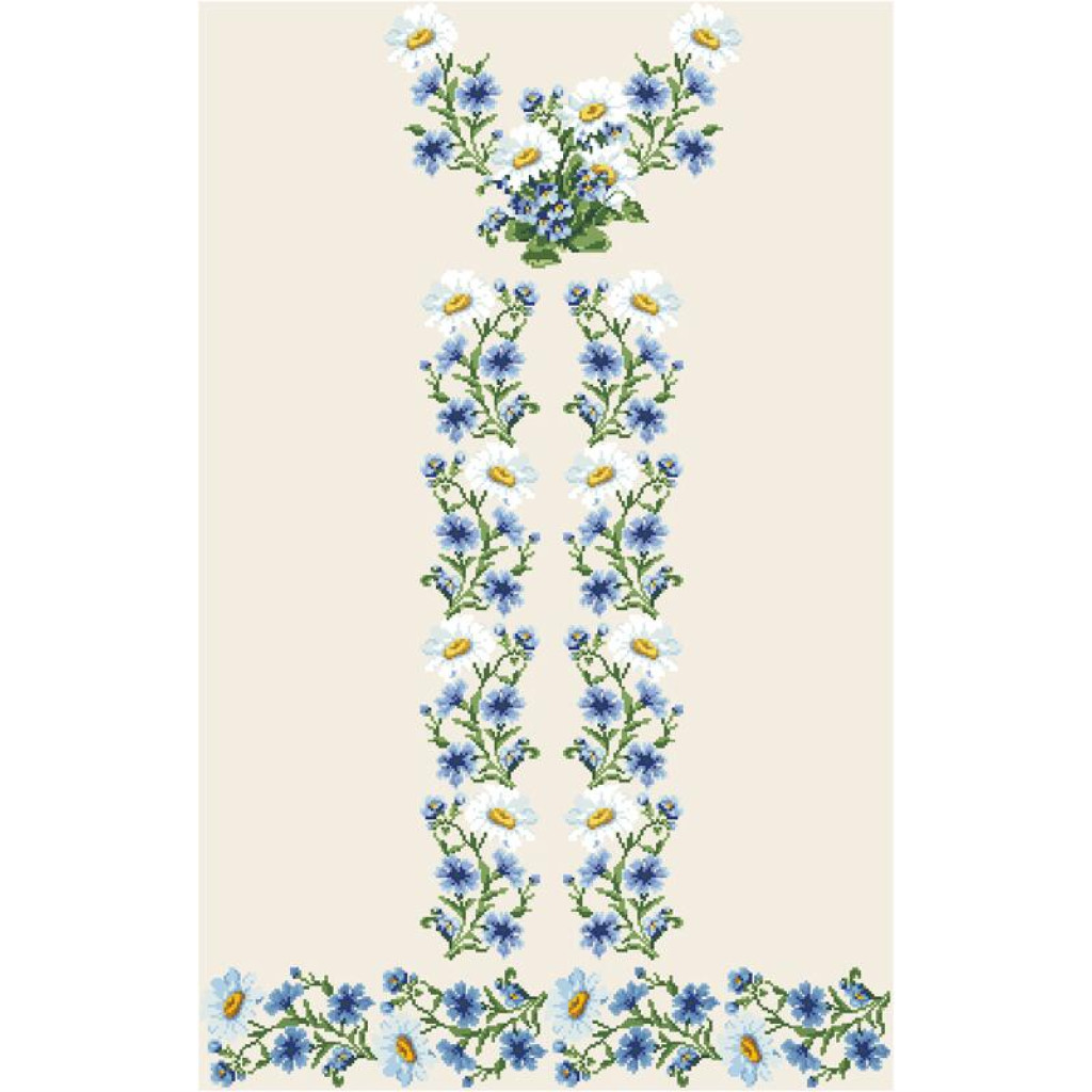 Заготовка для вишивки жіночої сукні Ромашки і волошки призначена для часткової зашивки бісером або нитками. Схема надрукована на льоні бежевого кольору екологічно чистими стійкими фарбами, що не змиваються після прання. Відрізи розкроєні з урахуванням необхідних запасів для зручного вишивання та подальшого пошиття виробу.