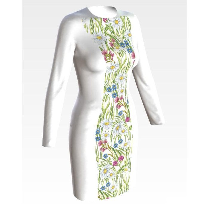 Заготовка для вишивки жіночої сукні Ромашки, волошки, дзвіночки призначена для часткової зашивки бісером або нитками. Схема надрукована на атлас-котоні білого кольору екологічно чистими стійкими фарбами, що не змиваються після прання. Відрізи розкроєні з урахуванням необхідних запасів для зручного вишивання та подальшого пошиття виробу.