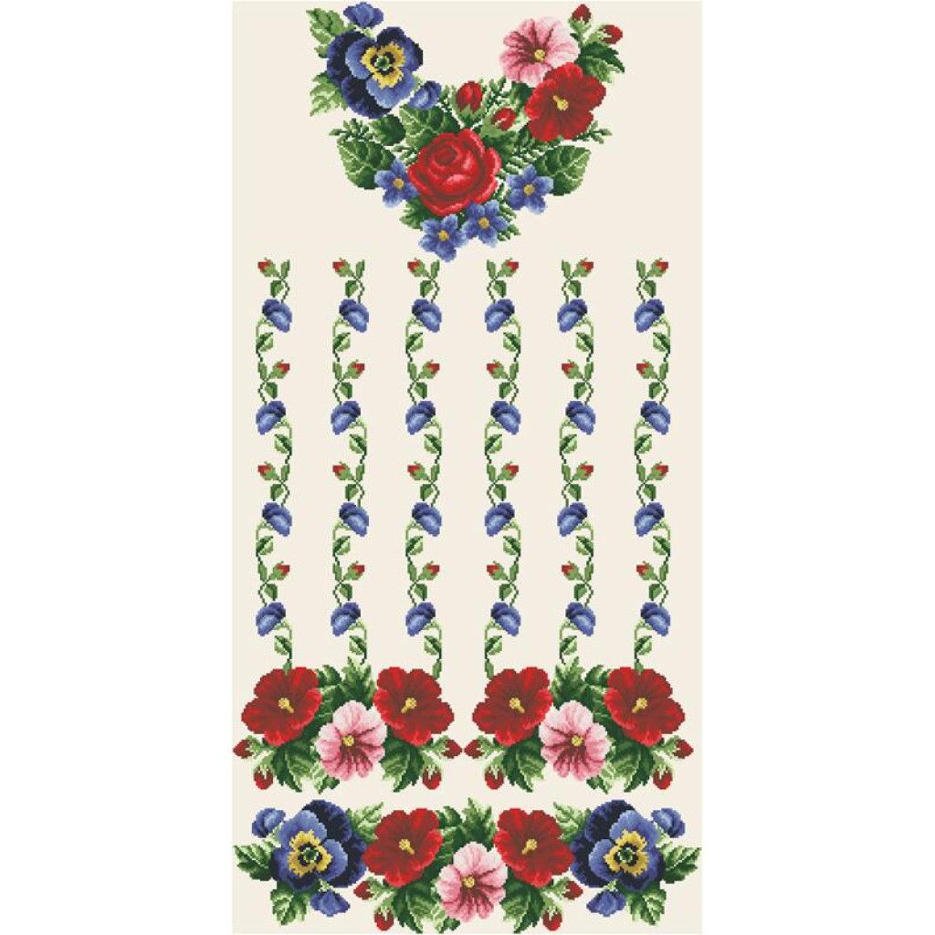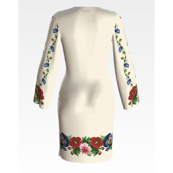 Заготовка для вишивки жіночої сукні Мальви, троянди, братки призначена для часткової зашивки бісером або нитками. Схема надрукована на атлас-котоні бежевого кольору екологічно чистими стійкими фарбами, що не змиваються після прання. Відрізи розкроєні з урахуванням необхідних запасів для зручного вишивання та подальшого пошиття виробу.