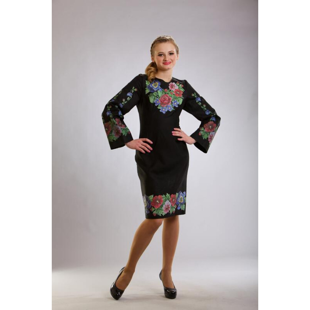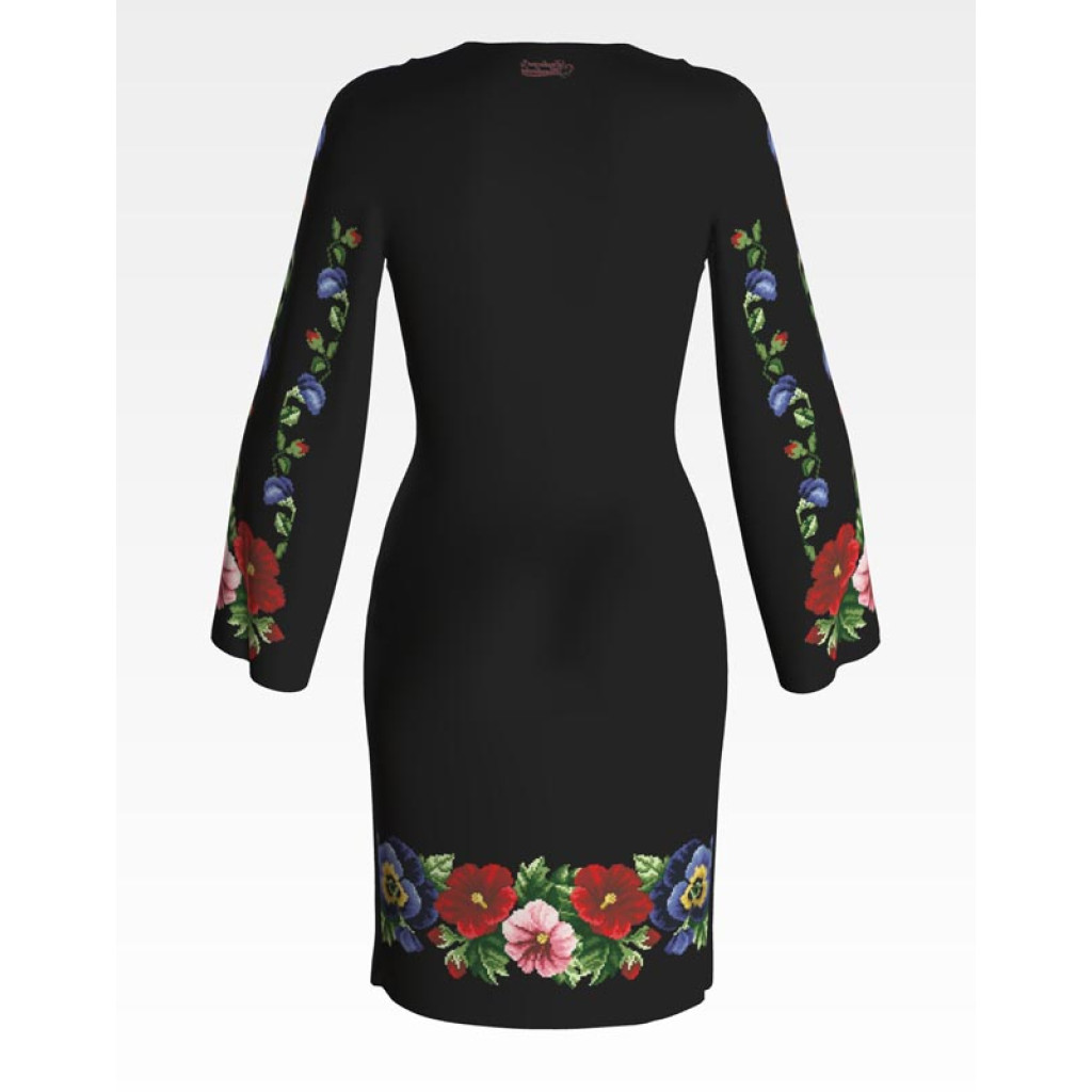 ПЛ351лЧнннн Барвиста вишиванка Заготовка для вишивки - Сукня жіноча Мальви, троянди, братки р.42-54 льон, чорний