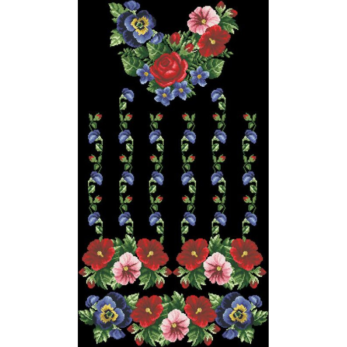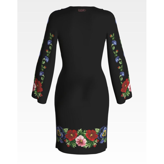 Заготовка для вишивки жіночої сукні Мальви, троянди, братки призначена для часткової зашивки бісером або нитками. Схема надрукована на льоні чорного кольору екологічно чистими стійкими фарбами, що не змиваються після прання. Відрізи розкроєні з урахуванням необхідних запасів для зручного вишивання та подальшого пошиття виробу.