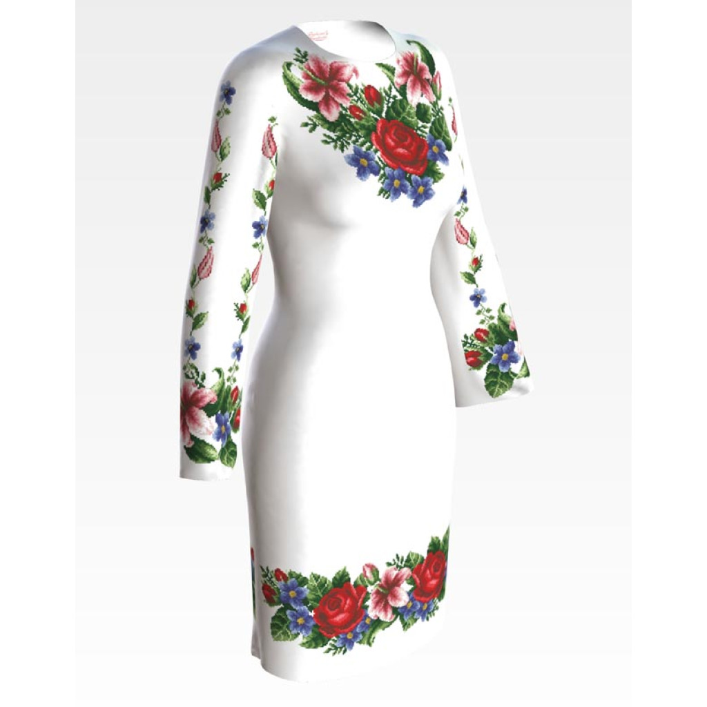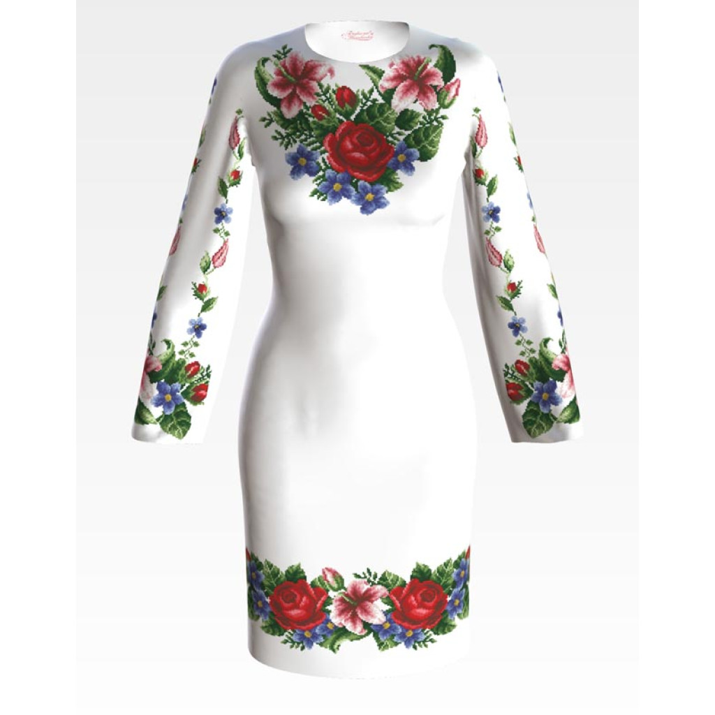 ПЛ361лБнннн Барвиста вишиванка Заготовка для вишивки - Сукня жіноча Лілеї, троянди, незабудки р.42-54 льон, білий