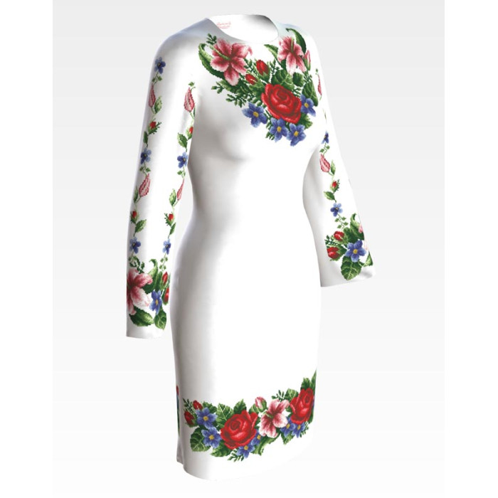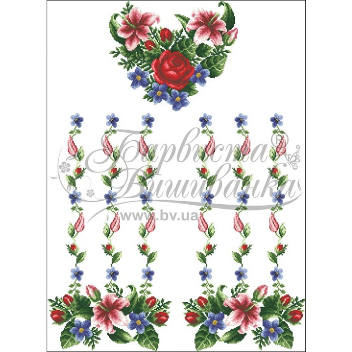 Заготовка для вишивки жіночої сукні Лілеї, троянди, незабудки призначена для часткової зашивки бісером або нитками. Схема надрукована на льоні білого кольору екологічно чистими стійкими фарбами, що не змиваються після прання. Відрізи розкроєні з урахуванням необхідних запасів для зручного вишивання та подальшого пошиття виробу.