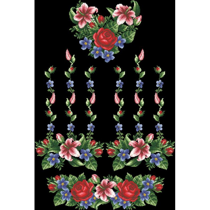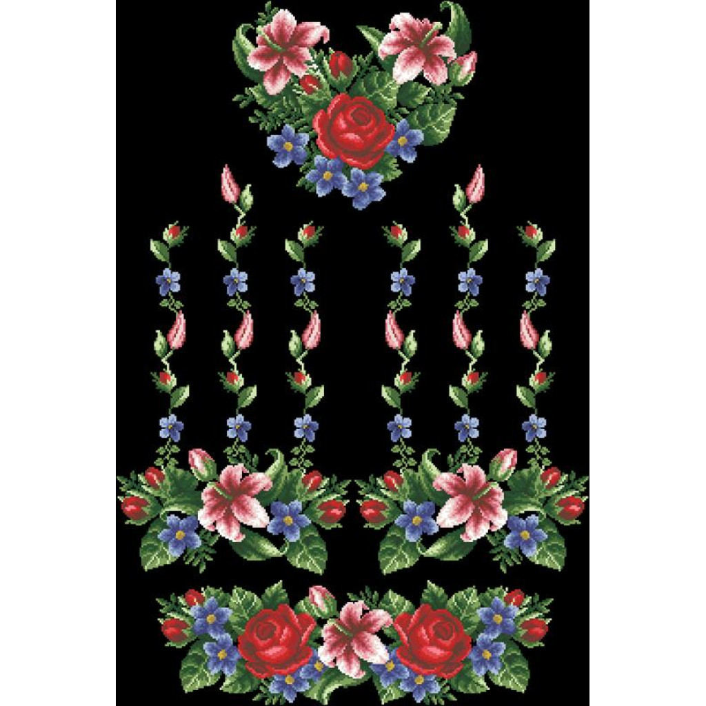 Заготовка для вишивки жіночої сукні Лілеї, троянди, незабудки призначена для часткової зашивки бісером або нитками. Схема надрукована на шовковій тканині чорного кольору екологічно чистими стійкими фарбами, що не змиваються після прання. Відрізи розкроєні з урахуванням запасів для зручного вишивання та подальшого пошиття виробу.