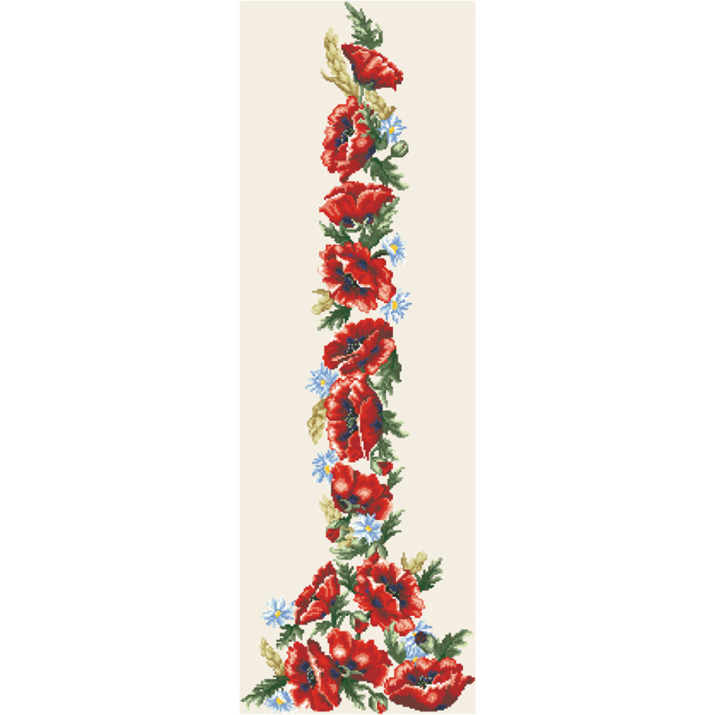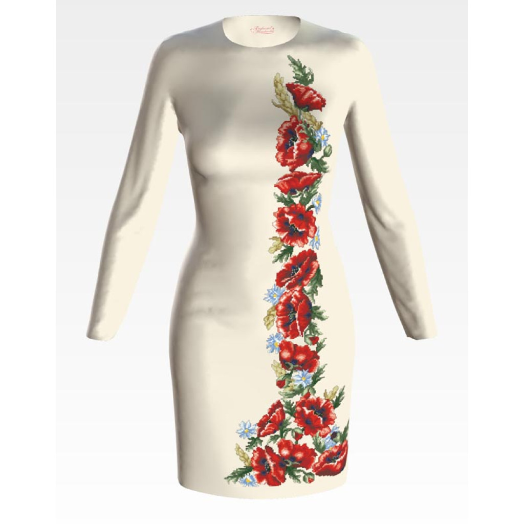 Заготовка для вишивки жіночої сукні Червоні маки, ромашки, колоски призначена для часткової зашивки бісером або нитками. Схема надрукована на домотканому полотні бежевого кольору екологічно чистими стійкими фарбами, що не змиваються після прання. Відрізи розкроєні з урахуванням необхідних запасів для зручного вишивання та подальшого пошиття виробу.