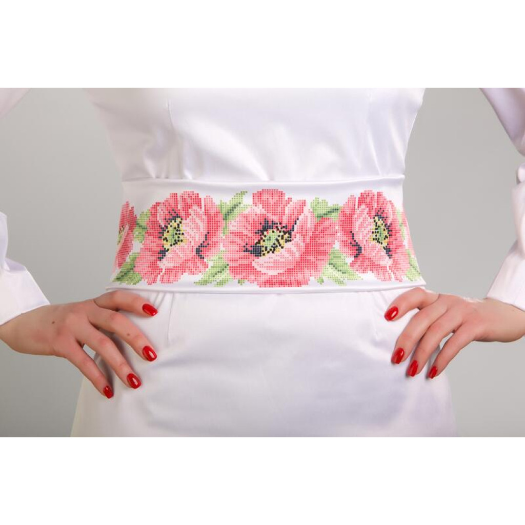 Заготовка для вишивки жіночого пояса Маки рожеві призначена для часткової зашивки бісером або нитками. Схема надрукована на білому габардині екологічно чистими стійкими фарбами, що не змиваються після прання. Відріз має достатні запаси для зручного вишивання та подальшого пошиття пояса.
