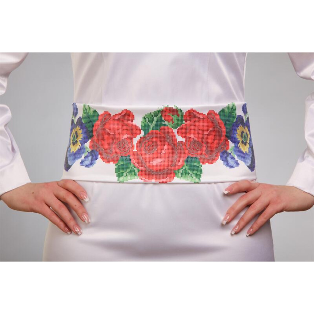 Заготовка для вишивки жіночого пояса Троянди, братки, мальви призначена для часткової зашивки бісером або нитками. Схема надрукована на білому габардині екологічно чистими стійкими фарбами, що не змиваються після прання. Відріз має достатні запаси для зручного вишивання та подальшого пошиття пояса.