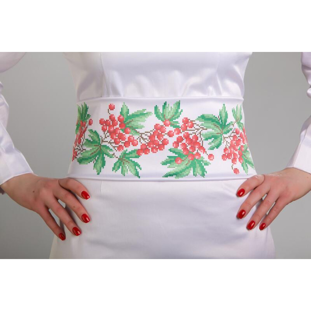 Заготовка для вишивки жіночого пояса Ніжна калина призначена для часткової зашивки бісером або нитками. Схема надрукована на білому габардині екологічно чистими стійкими фарбами, що не змиваються після прання. Відріз має достатні запаси для зручного вишивання та подальшого пошиття пояса.