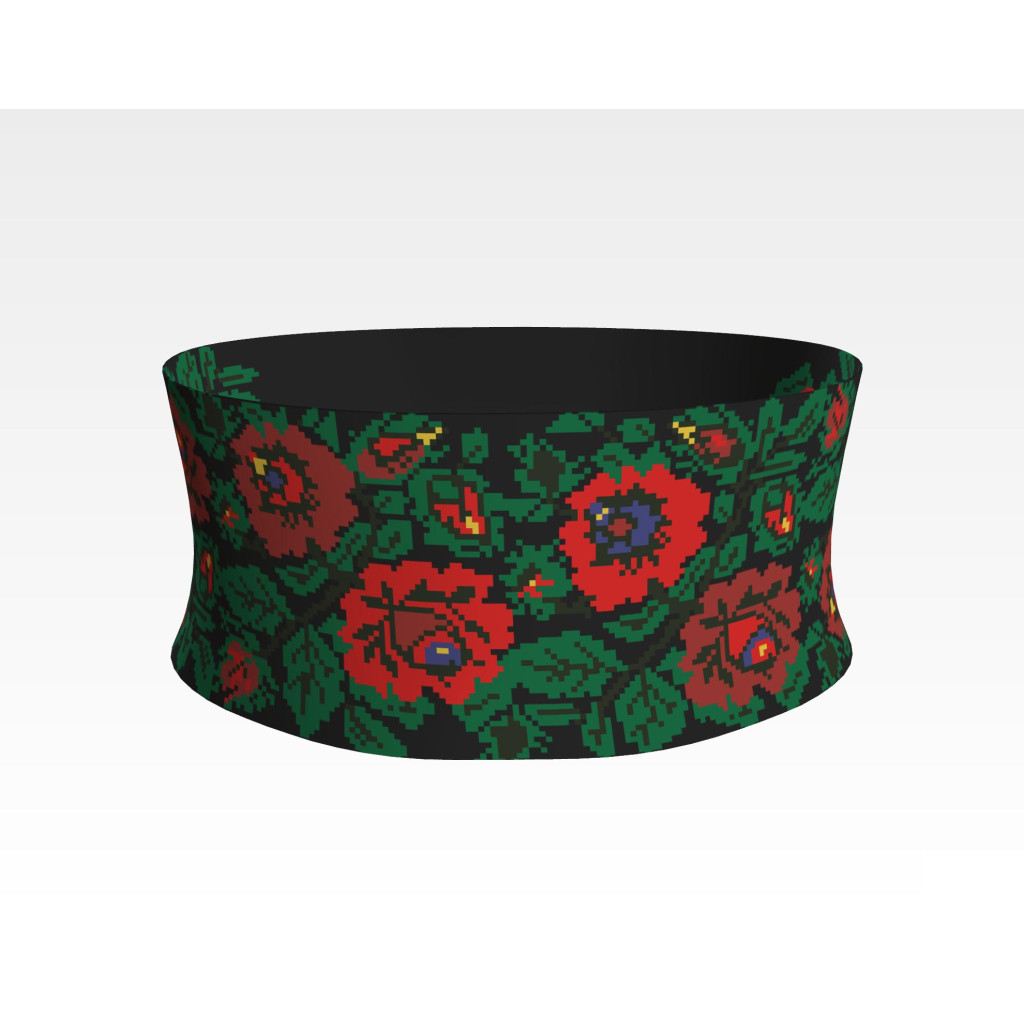 Заготовка для вишивки жіночого пояса Прикарпаття. Оберіг призначена для часткової зашивки бісером або нитками. Схема надрукована на шовковій тканині чорного кольору екологічно чистими стійкими фарбами, що не змиваються після прання. Відріз має достатні запаси для зручного вишивання та подальшого пошиття пояса.