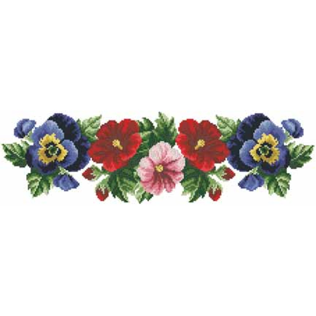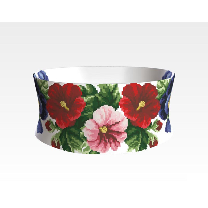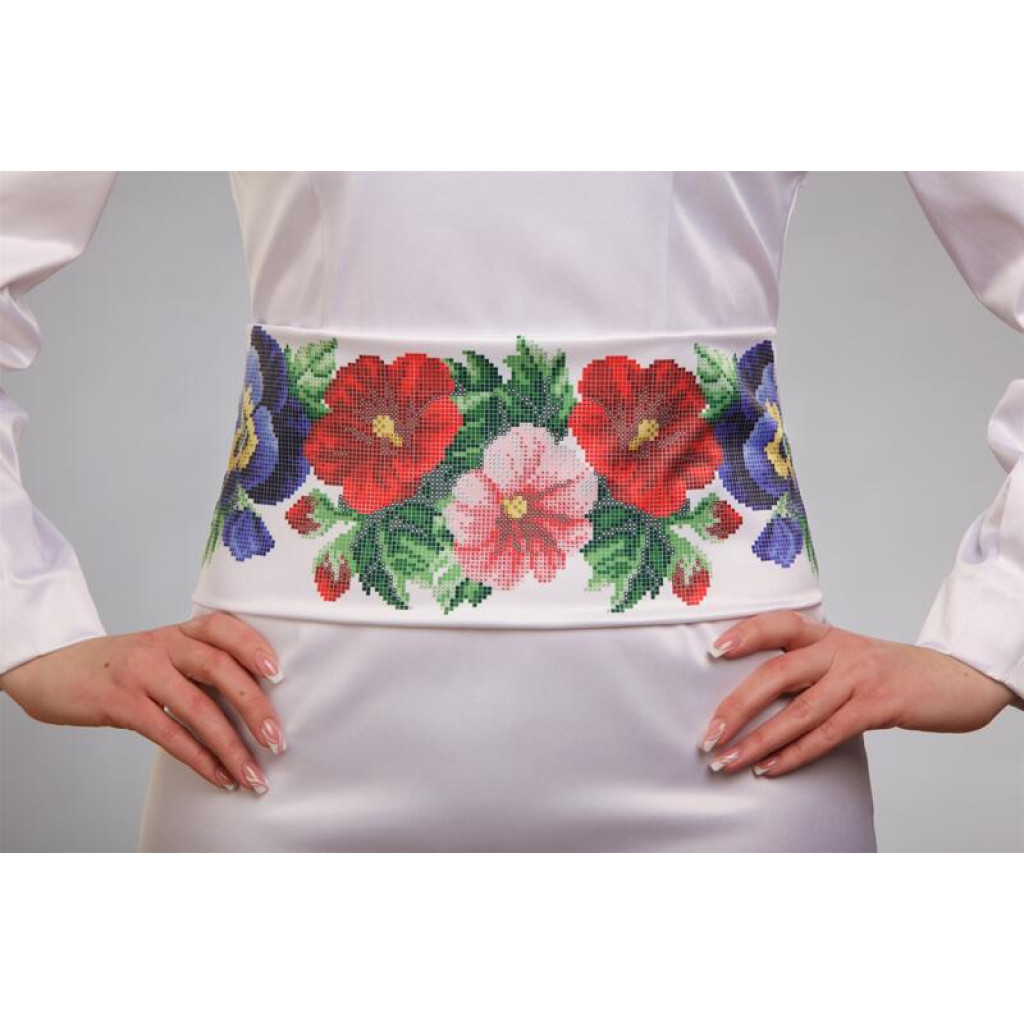 Заготовка для вишивки жіночого пояса Мальви, троянди, братки призначена для часткової зашивки бісером або нитками. Схема надрукована на білому габардині екологічно чистими стійкими фарбами, що не змиваються після прання. Відріз має достатні запаси для зручного вишивання та подальшого пошиття пояса.