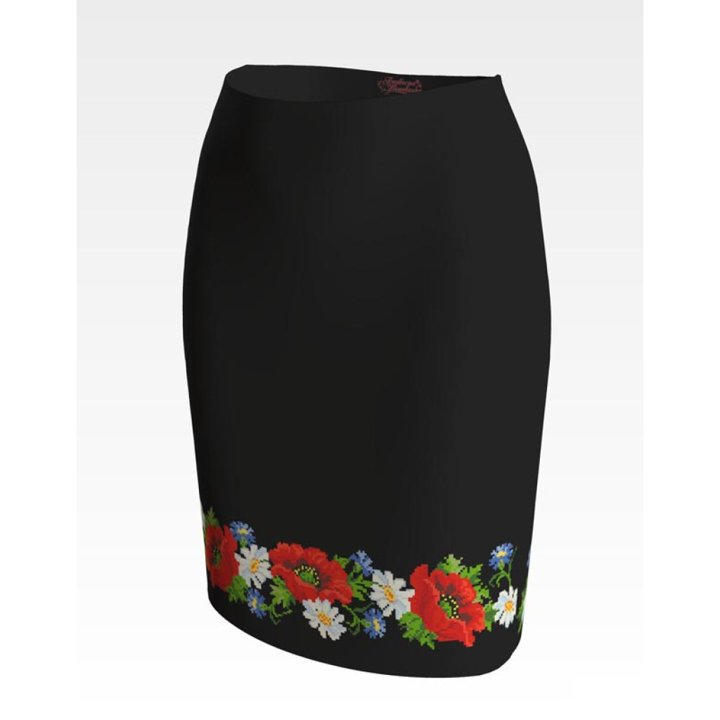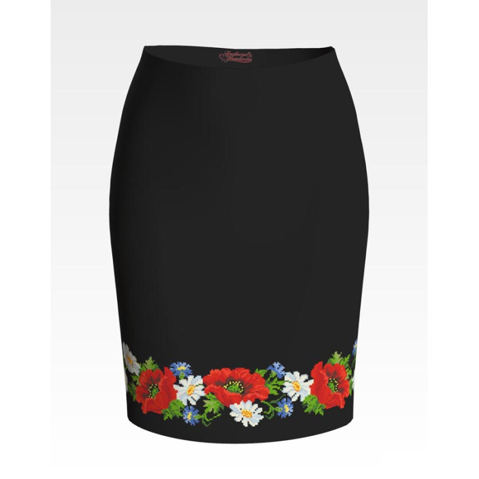 Заготовка для вишивки жіночої спідниці Маки, ромашки, волошки призначена для часткової зашивки бісером або нитками. Схема надрукована на шовковій тканині чорного кольору екологічно чистими стійкими фарбами, що не змиваються після прання. Відрізи розкроєні з урахуванням запасів для зручного вишивання та подальшого пошиття виробу.
