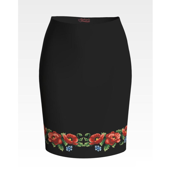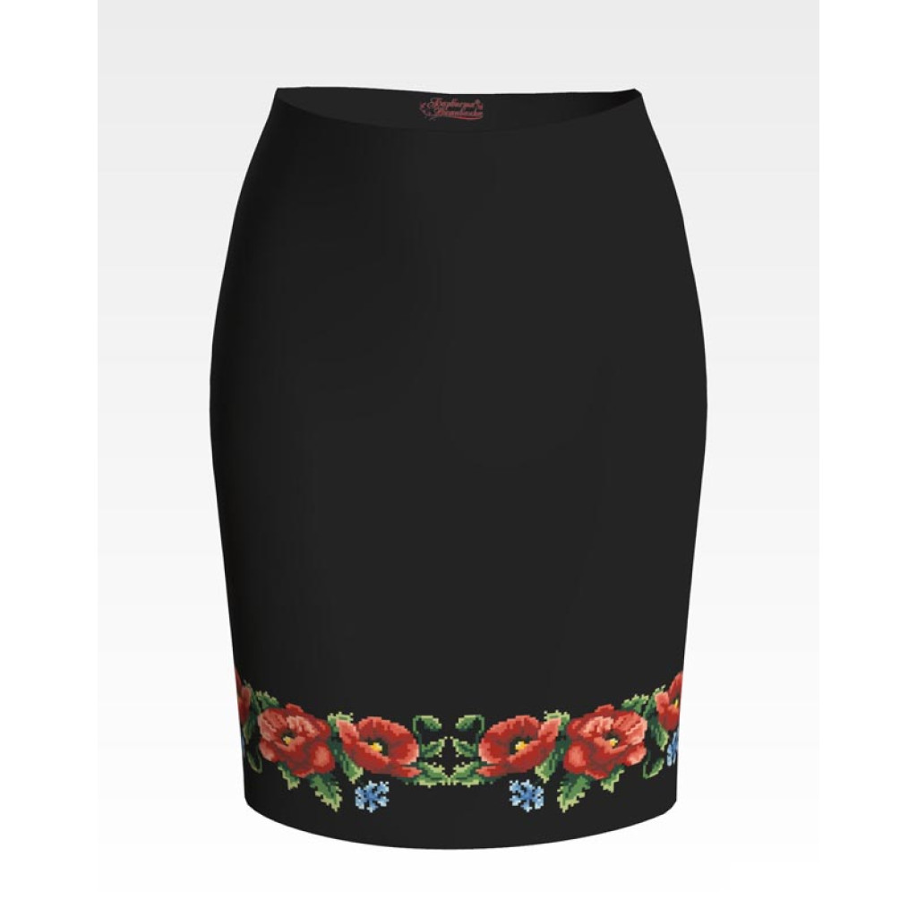 Заготовка для вишивки жіночої спідниці Маки, волошки призначена для часткової зашивки бісером або нитками. Схема надрукована на шовковій тканині чорного кольору екологічно чистими стійкими фарбами, що не змиваються після прання. Відрізи розкроєні з урахуванням запасів для зручного вишивання та подальшого пошиття виробу.