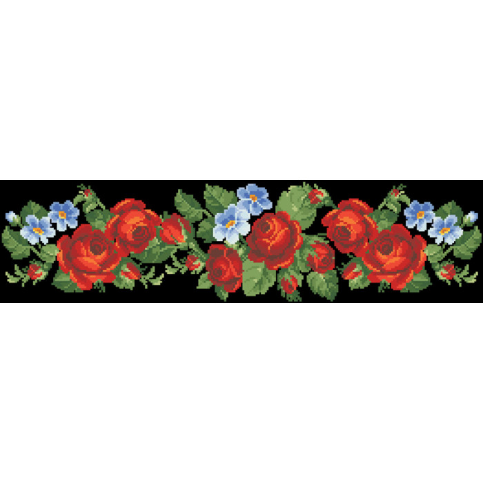 Заготовка для вишивки жіночої спідниці Пристрасні троянди, фіалки призначена для часткової зашивки бісером або нитками. Схема надрукована на шовковій тканині чорного кольору екологічно чистими стійкими фарбами, що не змиваються після прання. Відрізи розкроєні з урахуванням запасів для зручного вишивання та подальшого пошиття виробу.