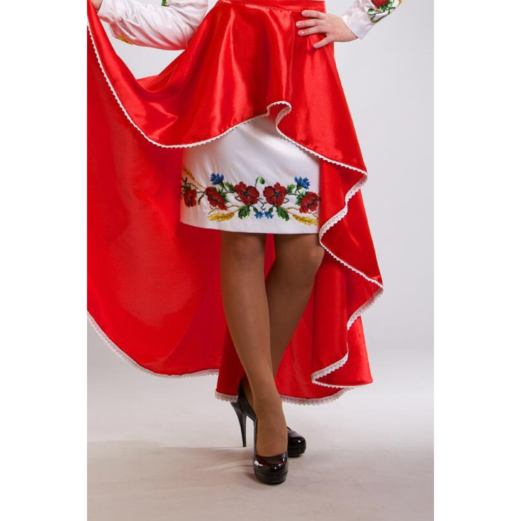 Заготовка для вишивки жіночої спідниці Маки, волошки, колоски призначена для часткової зашивки бісером або нитками. Схема надрукована на білому габардині екологічно чистими стійкими фарбами, що не змиваються після прання. Відрізи розкроєні з урахуванням запасів для зручного вишивання та подальшого пошиття виробу.