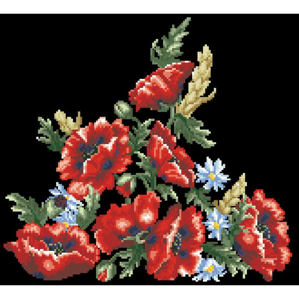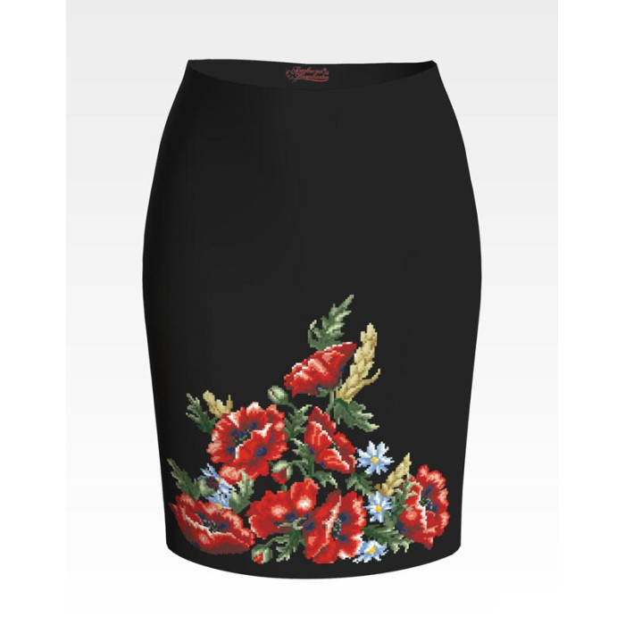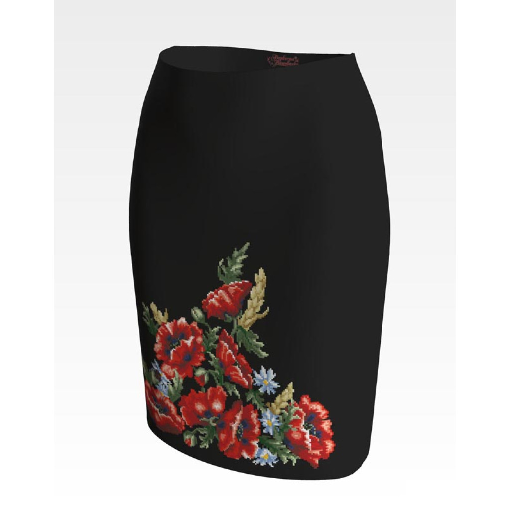 Заготовка для вишивки жіночої спідниці Червоні маки, ромашки, колоски призначена для часткової зашивки бісером або нитками. Схема надрукована на шовковій тканині чорного кольору екологічно чистими стійкими фарбами, що не змиваються після прання. Відрізи розкроєні з урахуванням запасів для зручного вишивання та подальшого пошиття виробу.