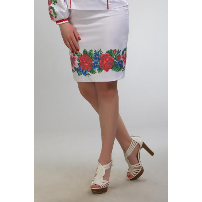 СЖ055пБнннн Барвиста вишиванка Заготовка для вишивки - Спідниця жіноча Лілеї, троянди, незабудки р.42-54 габардин, білий