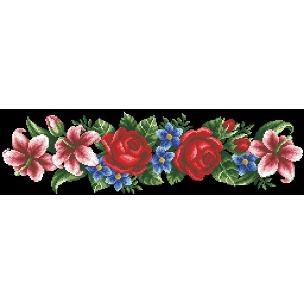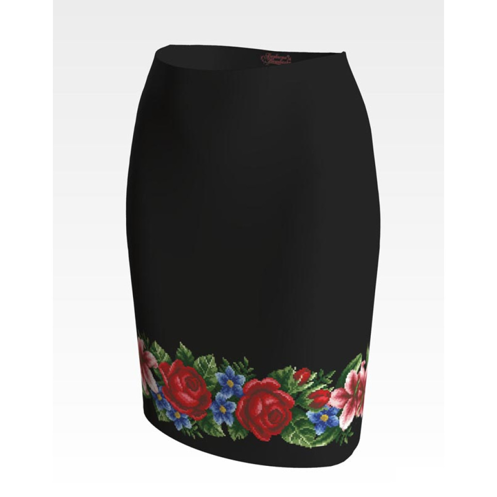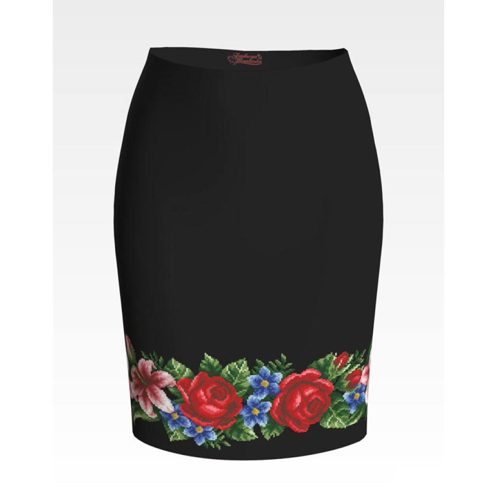 Заготовка для вишивки жіночої спідниці Лілеї, троянди, незабудки призначена для часткової зашивки бісером або нитками. Схема надрукована на шовковій тканині чорного кольору екологічно чистими стійкими фарбами, що не змиваються після прання. Відрізи розкроєні з урахуванням запасів для зручного вишивання та подальшого пошиття виробу.