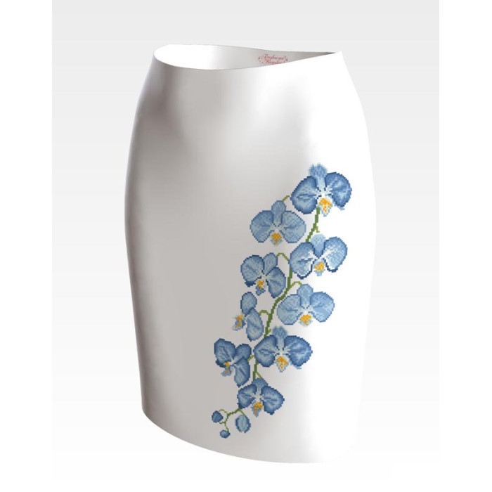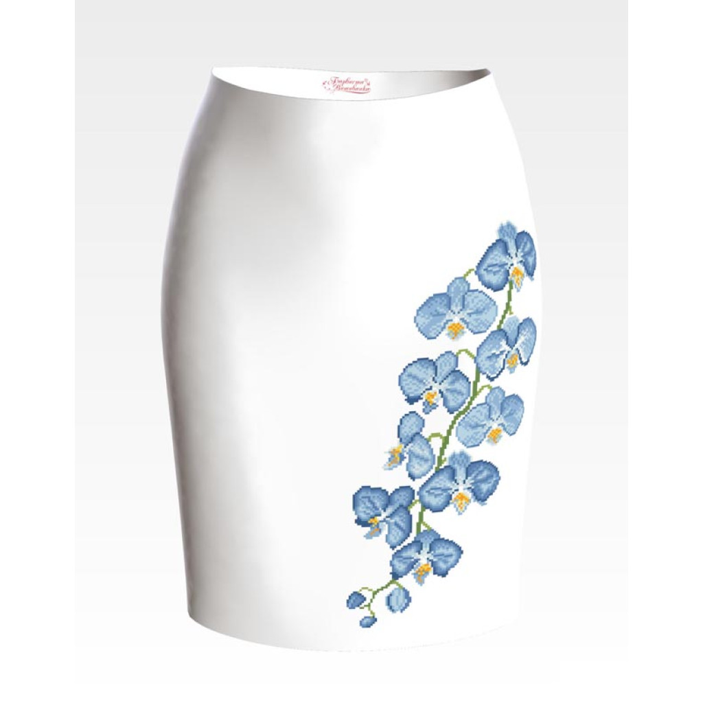 Заготовка для вишивки жіночої спідниці Блакитні орхідеї призначена для часткової зашивки бісером або нитками. Схема надрукована на білому габардині екологічно чистими стійкими фарбами, що не змиваються після прання. Відрізи розкроєні з урахуванням запасів для зручного вишивання та подальшого пошиття виробу.