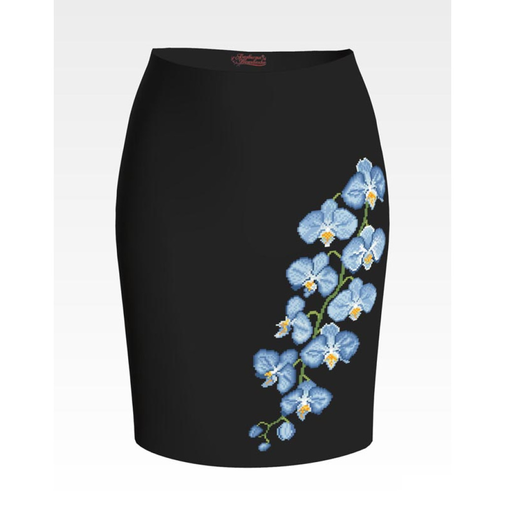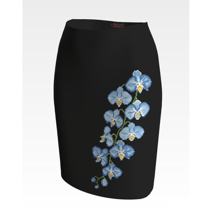 Заготовка для вишивки жіночої спідниці Блакитні орхідеї призначена для часткової зашивки бісером або нитками. Схема надрукована на шовковій тканині чорного кольору екологічно чистими стійкими фарбами, що не змиваються після прання. Відрізи розкроєні з урахуванням запасів для зручного вишивання та подальшого пошиття виробу.