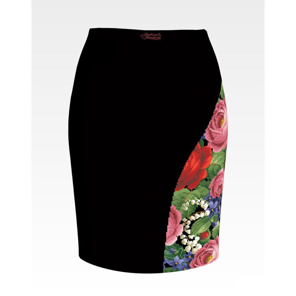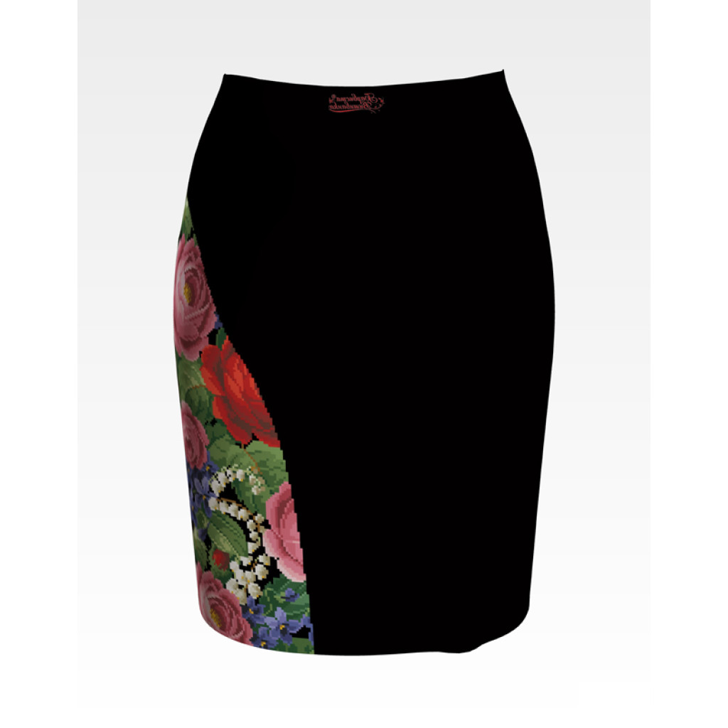Заготовка для вишивки жіночої спідниці Розкішні троянди, фіалки, конвалії призначена для часткової зашивки бісером або нитками. Схема надрукована на шовковій тканині чорного кольору екологічно чистими стійкими фарбами, що не змиваються після прання. Відрізи розкроєні з урахуванням запасів для зручного вишивання та подальшого пошиття виробу.