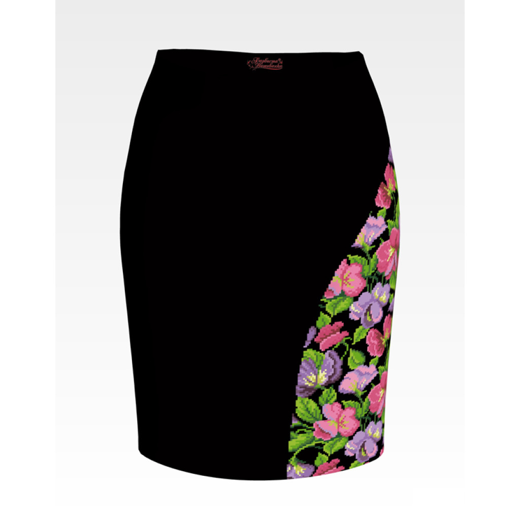 Заготовка для вишивки жіночої спідниці Фіалки призначена для часткової зашивки бісером або нитками. Схема надрукована на шовковій тканині чорного кольору екологічно чистими стійкими фарбами, що не змиваються після прання. Відрізи розкроєні з урахуванням запасів для зручного вишивання та подальшого пошиття виробу.