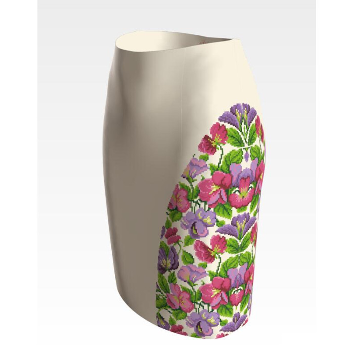 Заготовка для вишивки жіночої спідниці Фіалки призначена для часткової зашивки бісером або нитками. Схема надрукована на шовковій тканині бежевого кольору екологічно чистими стійкими фарбами, що не змиваються після прання. Відрізи розкроєні з урахуванням запасів для зручного вишивання та подальшого пошиття виробу.