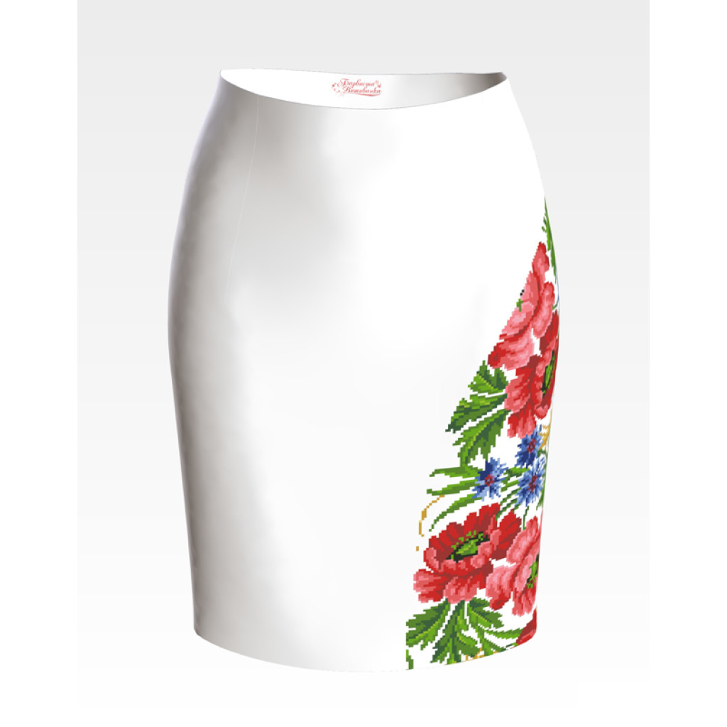 Заготовка для вишивки жіночої спідниці Червоні маки, волошки, колоски призначена для часткової зашивки бісером або нитками. Схема надрукована на білому габардині екологічно чистими стійкими фарбами, що не змиваються після прання. Відрізи розкроєні з урахуванням запасів для зручного вишивання та подальшого пошиття виробу.