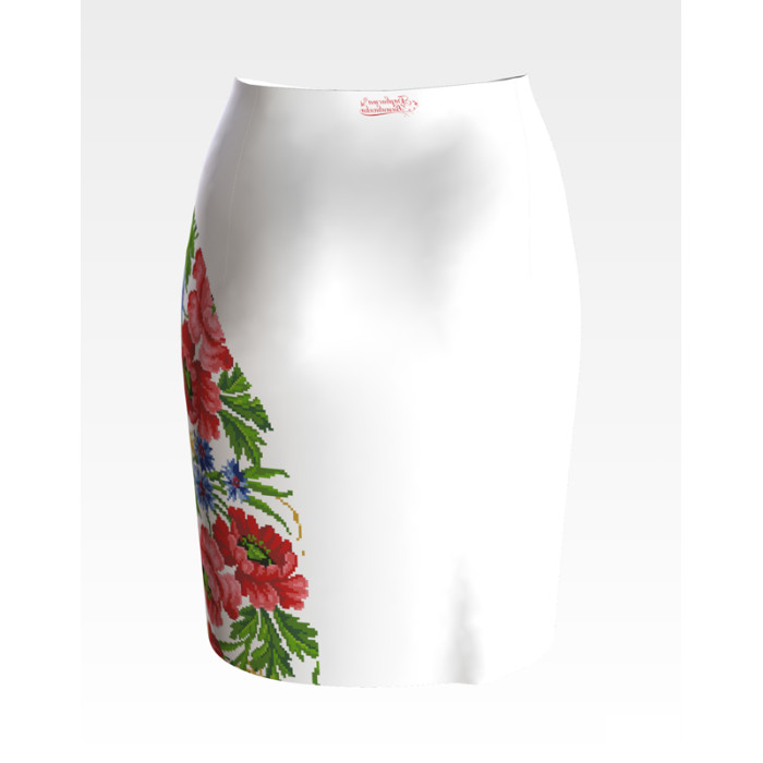 Заготовка для вишивки жіночої спідниці Червоні маки, волошки, колоски призначена для часткової зашивки бісером або нитками. Схема надрукована на шовковій тканині білого кольору екологічно чистими стійкими фарбами, що не змиваються після прання. Відрізи розкроєні з урахуванням запасів для зручного вишивання та подальшого пошиття виробу.