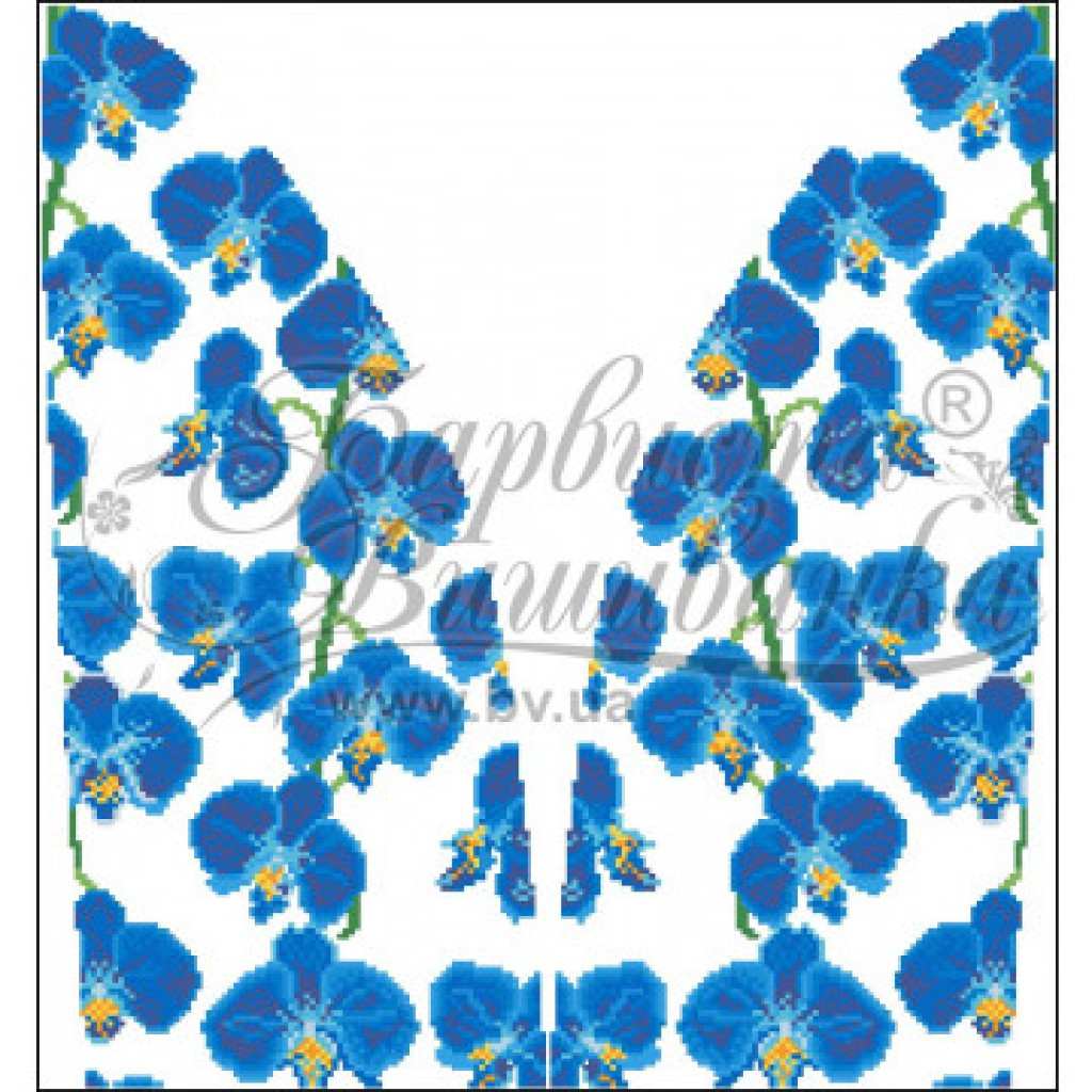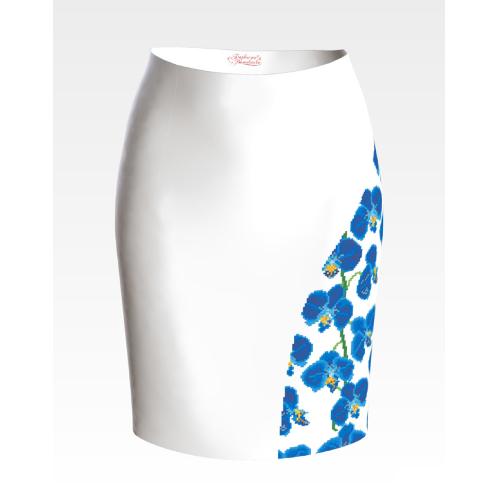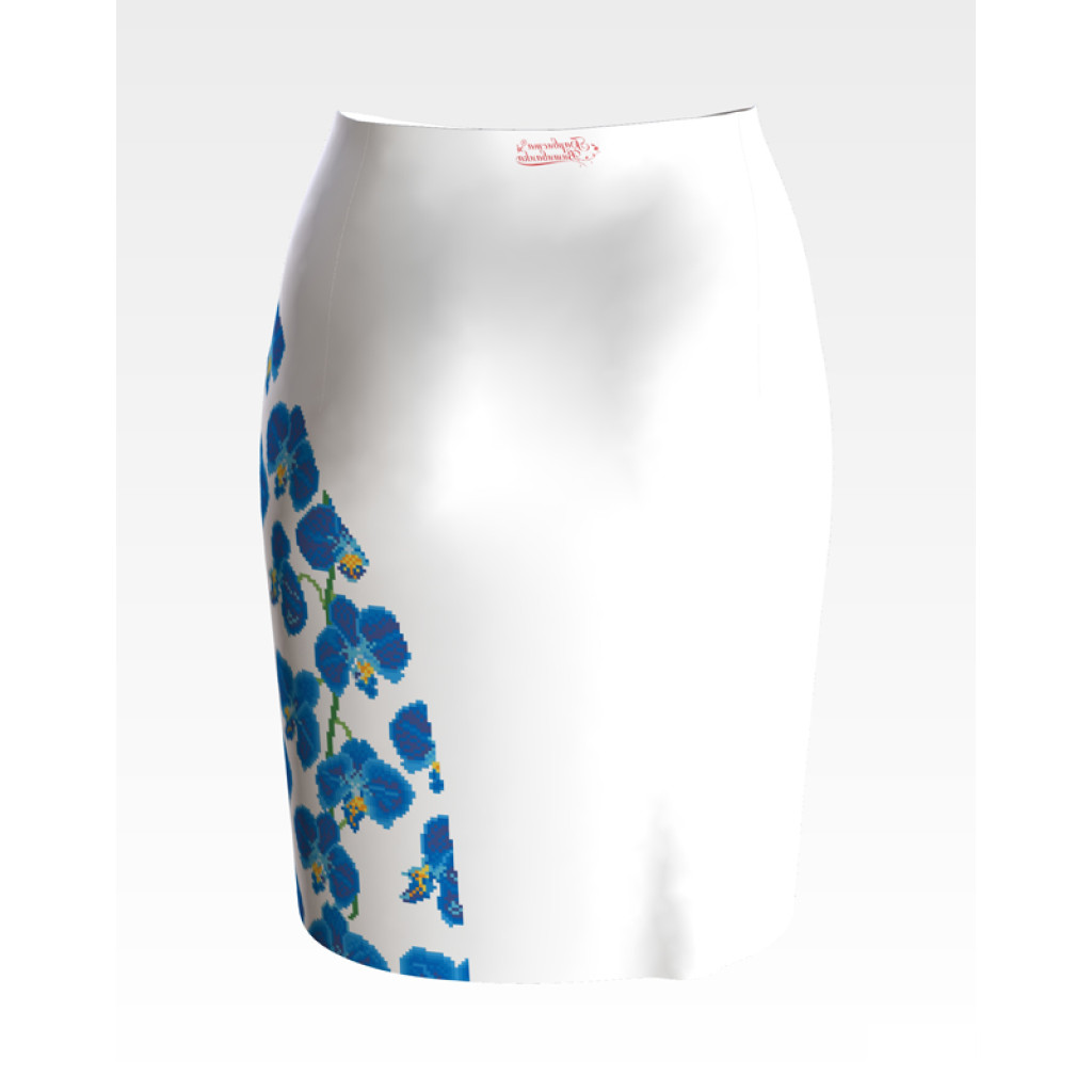 Заготовка для вишивки жіночої спідниці Сині орхідеї призначена для часткової зашивки бісером або нитками. Схема надрукована на білому габардині екологічно чистими стійкими фарбами, що не змиваються після прання. Відрізи розкроєні з урахуванням запасів для зручного вишивання та подальшого пошиття виробу.