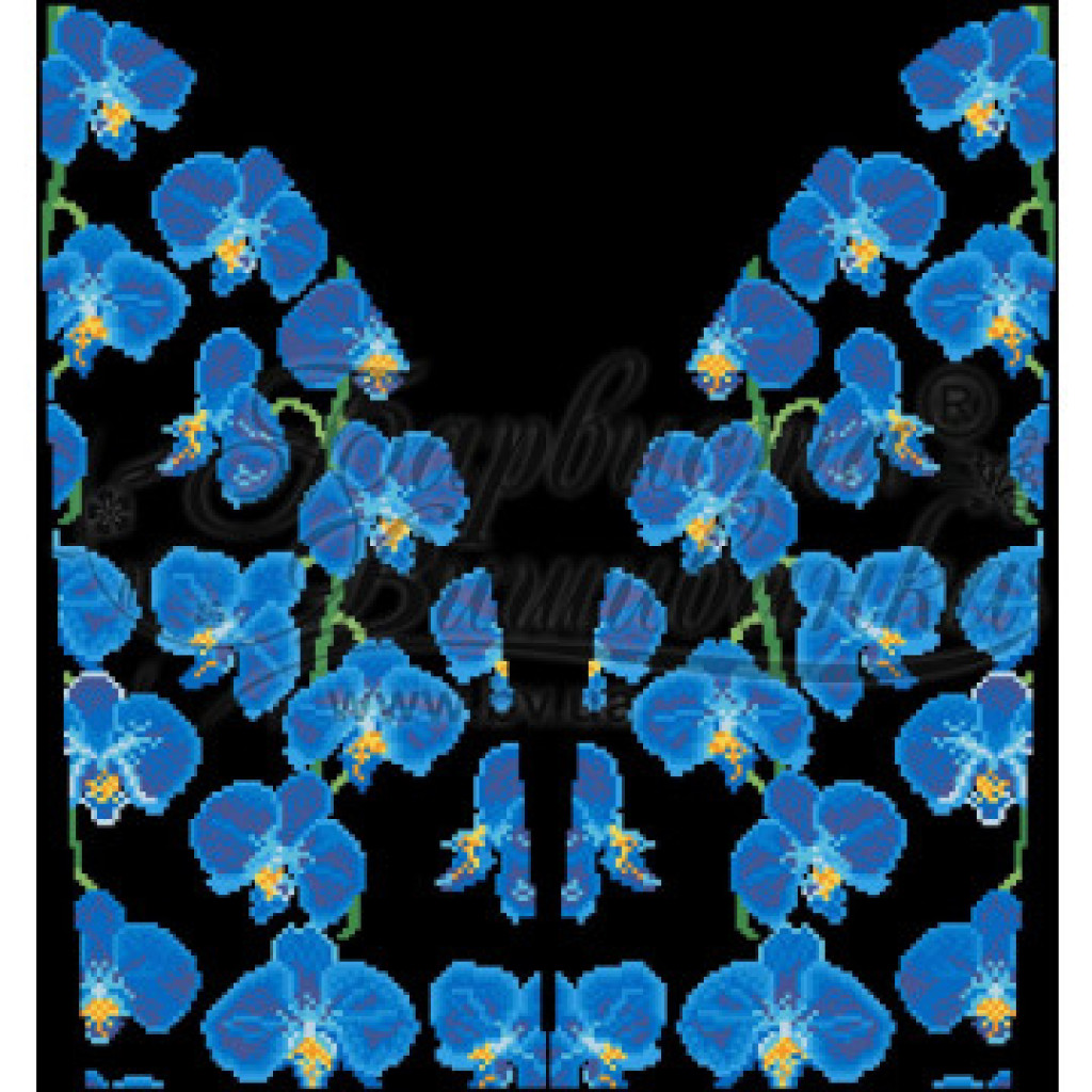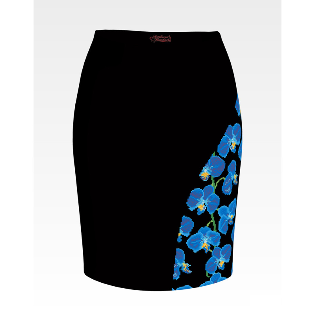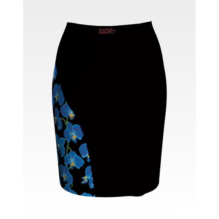 Заготовка для вишивки жіночої спідниці Сині орхідеї призначена для часткової зашивки бісером або нитками. Схема надрукована на шовковій тканині чорного кольору екологічно чистими стійкими фарбами, що не змиваються після прання. Відрізи розкроєні з урахуванням запасів для зручного вишивання та подальшого пошиття виробу.