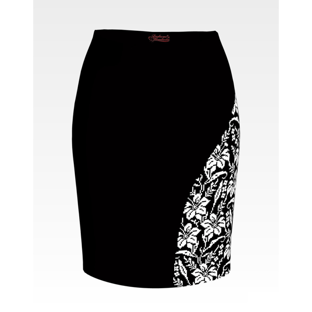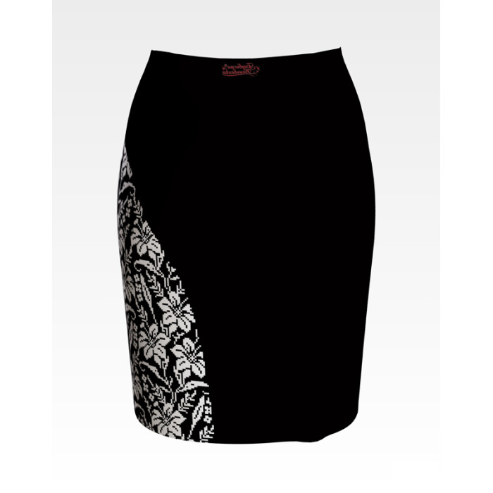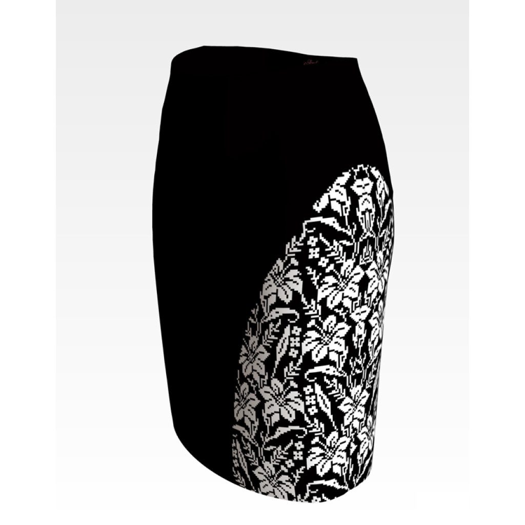 Заготовка для вишивки жіночої спідниці Лілії. Орнамент призначена для часткової зашивки бісером або нитками. Схема надрукована на шовковій тканині чорного кольору екологічно чистими стійкими фарбами, що не змиваються після прання. Відрізи розкроєні з урахуванням запасів для зручного вишивання та подальшого пошиття виробу.