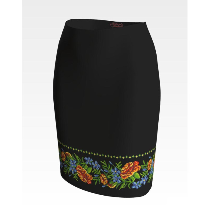 Заготовка для вишивки жіночої спідниці Мамині чорнобривці призначена для часткової зашивки бісером або нитками. Схема надрукована на атлас-котоні чорного кольору екологічно чистими стійкими фарбами, що не змиваються після прання. Відрізи розкроєні з урахуванням запасів для зручного вишивання та подальшого пошиття виробу.