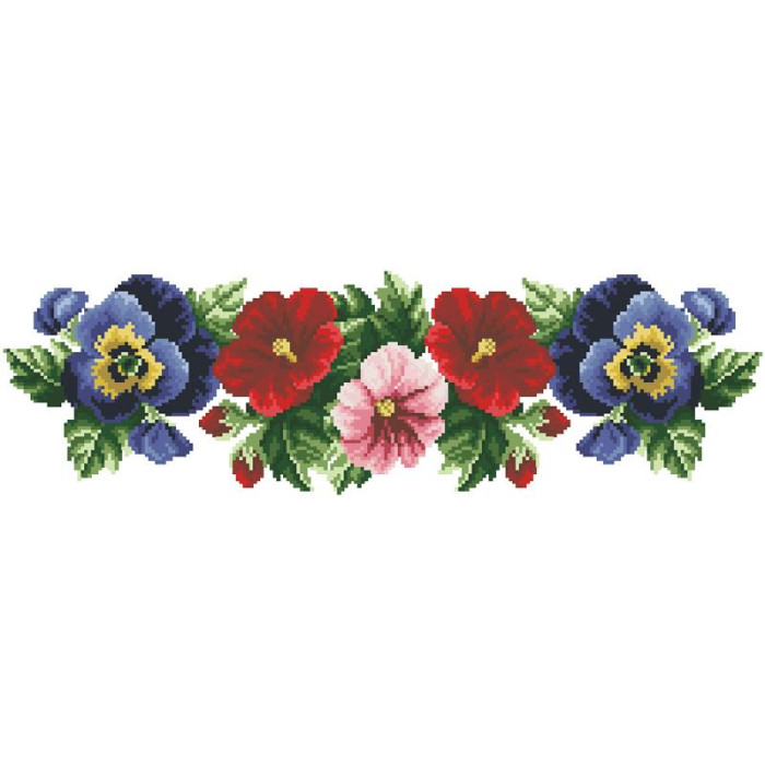 Заготовка для вишивки жіночої спідниці Мальви, троянди, братки призначена для часткової зашивки бісером або нитками. Схема надрукована на білому габардині екологічно чистими стійкими фарбами, що не змиваються після прання. Відрізи розкроєні з урахуванням запасів для зручного вишивання та подальшого пошиття виробу.
