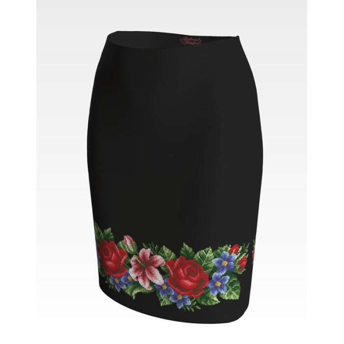 Заготовка для вишивки жіночої спідниці Лілеї, троянди, незабудки призначена для часткової зашивки бісером або нитками. Схема надрукована на шовковій тканині чорного кольору екологічно чистими стійкими фарбами, що не змиваються після прання. Відрізи розкроєні з урахуванням запасів для зручного вишивання та подальшого пошиття виробу.