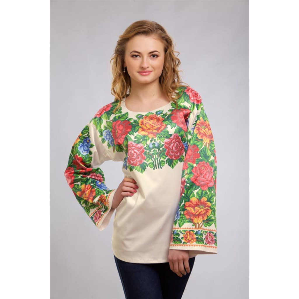 БЖ030кМнннн Вишиванка жіноча Вишукана. Буковинська, атлас-котон, бежевий, р. 42-54. Барвиста вишиванка. Заготовка для вишивання бісером або нитками.