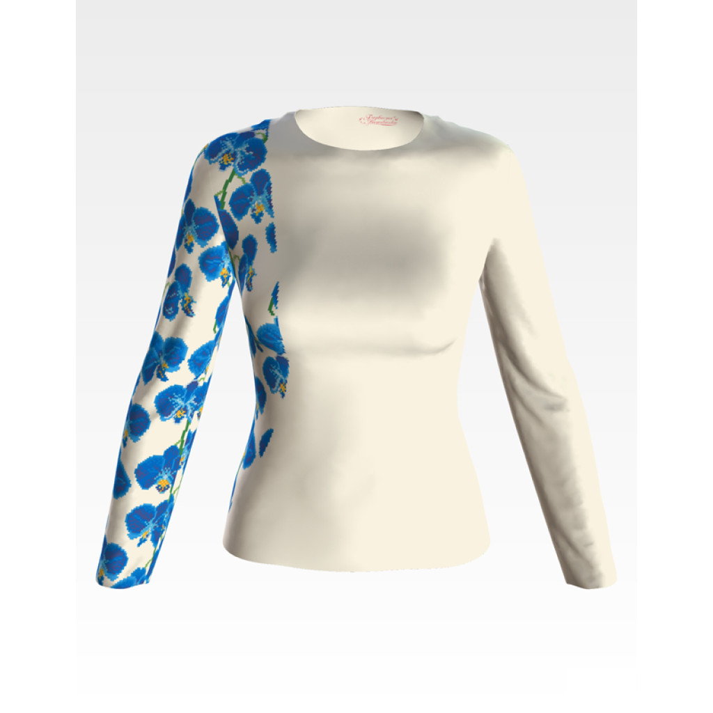 БЖ183кМнннн Вишиванка жіноча Сині орхідеї, атлас-котон, бежевий, р. 42-54. Барвиста вишиванка. Заготовка для вишивання бісером або нитками.