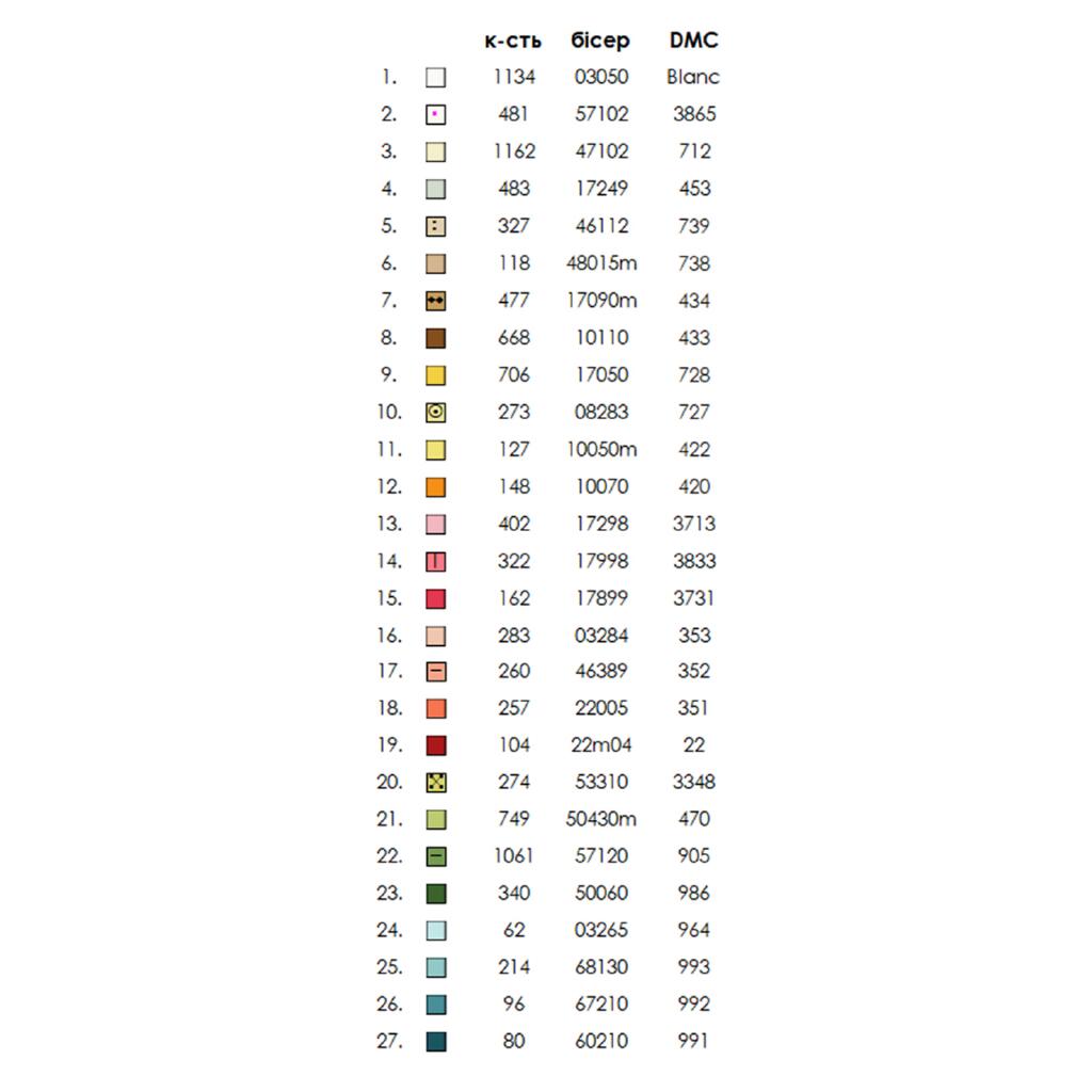 • титулка-ключ із рекомендованими кольорами бісеру Preciosa та ниток муліне DMC, а також їх кількістю