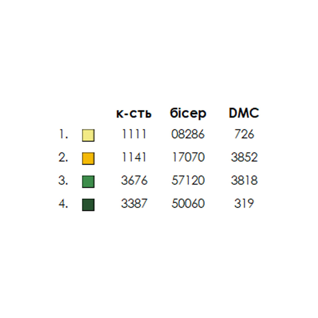 • титулка-ключ із рекомендованими кольорами бісеру Preciosa та ниток муліне DMC, а також їх кількістю