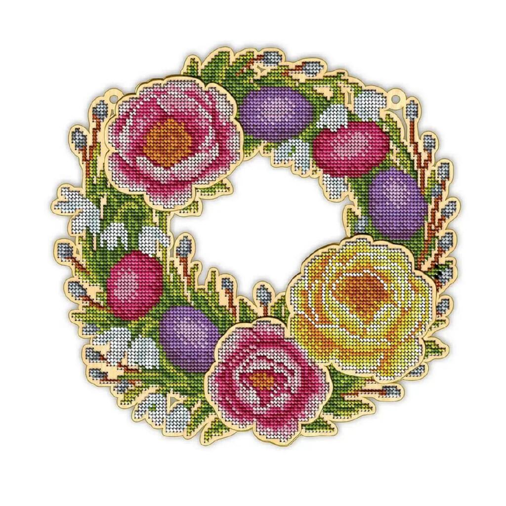 Загальна кількість деталей з фанери — 5 шт. Накладні елементи необхідно склеїти універсальним клеєм сильної фіксації. Вишитий віночок стане стильним декоративним акцентом інтер’єру та чудовим подарунком до свят.