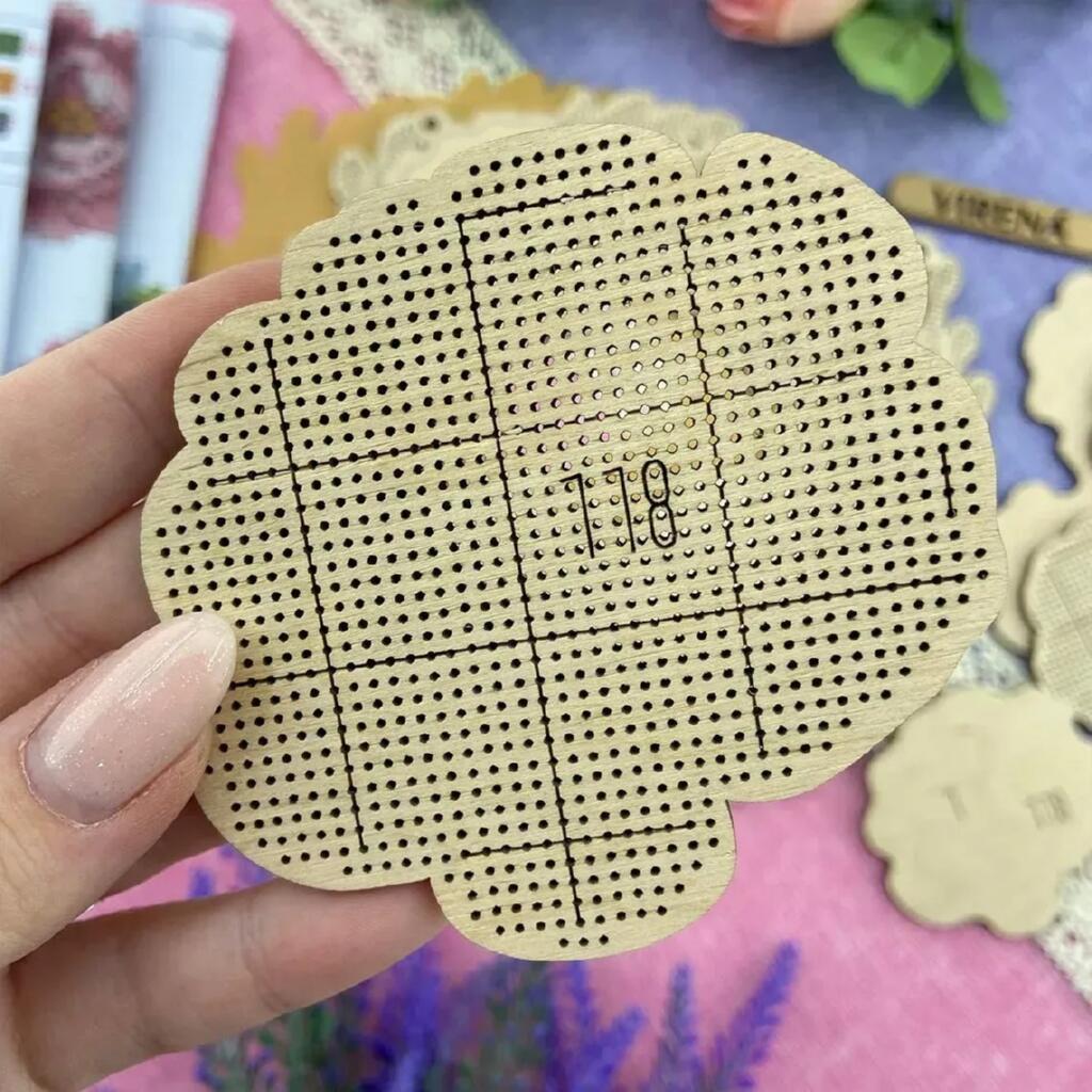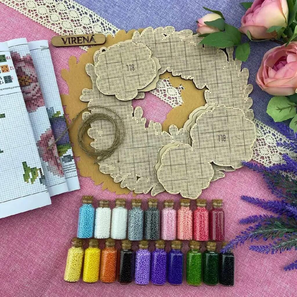 Набір дерев'яних заготовок призначений для створення об’ємного настінного віночка, вишитого бісером. Завдяки розміщенню перфорованих пластин у два яруси формується виразний об’ємний ефект, який надає виробу глибини та декоративності.