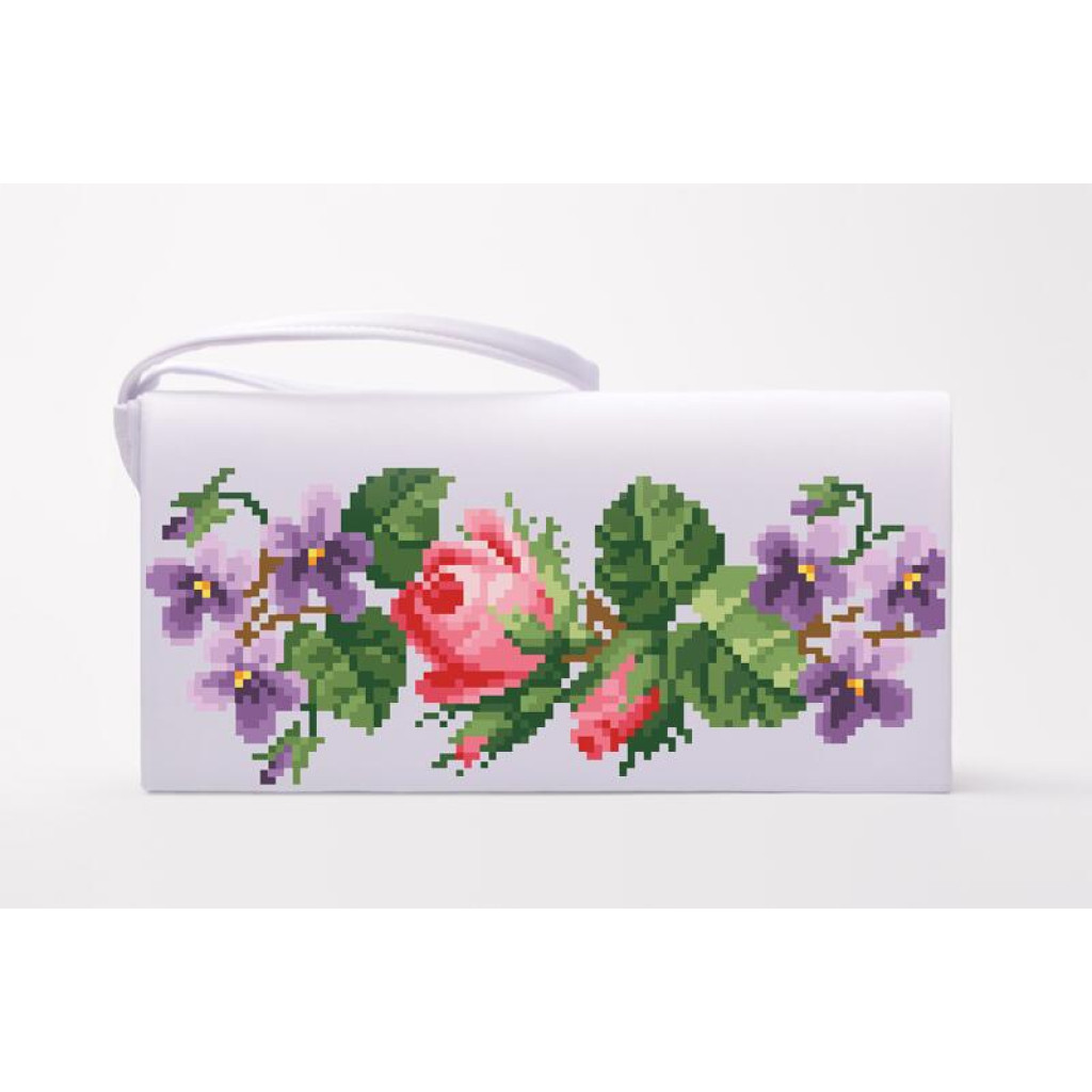 КЛ022дБ1301k Барвиста вишиванка Набір для вишивки бісером - Клатч Троянди і фіалки 21x13 см домоткане полотно, білий