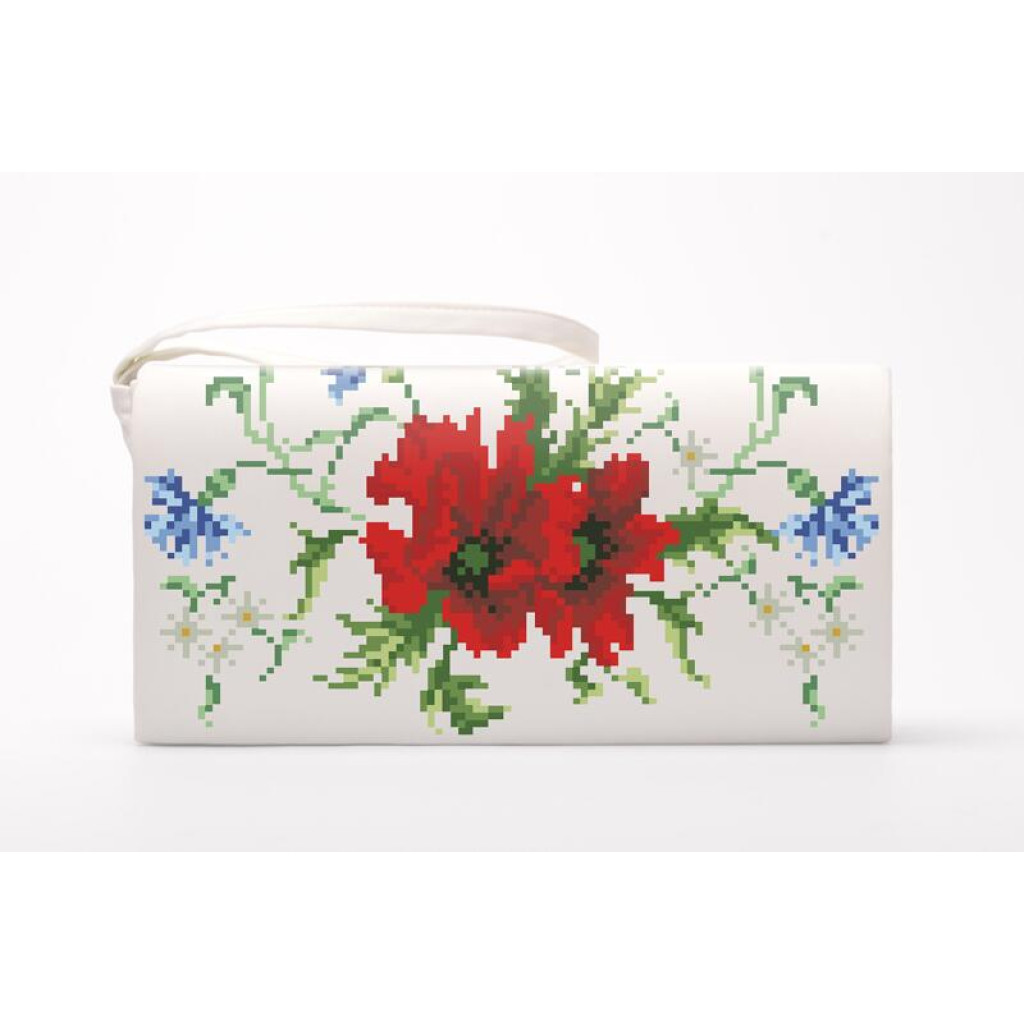 Набір для вишивки бісером пошитого клатча Ніжні маки, волошки, колоскивід Барвиста вишиванка призначений для часткової зашивки бісером по надрукованій схемі. Малюнок нанесений на шовкову тканину бежевого кольору стійкими екологічними фарбами, що не змиваються під час дбайливого прання. Клатч уже має готову форму, а використання чеського бісеру Preciosa №10 дозволяє створити акуратну фактуру вишивки бісером.