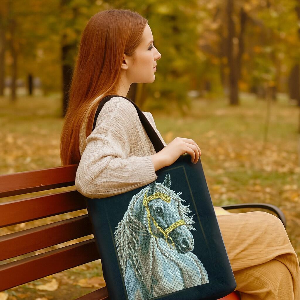 Сумка-шоппер для вишивки бісером на сумочній тканині, має довгі та зручні ручки, довжина ручок 65 см. Шоппер повністю зшитий та не потребує додаткових операцій зі зшивання. Простий, зручний, зносостійкий і практичний шоппер який застібається на блискавку. В середині шопер маэ щільну якісну підкладка та накладну кишеню. Доступ до вишивки є через не зашитий отвір у підкладці. Схема чітка з насиченими кольорами та високою якістю друку, після прання схема для вишивки залишається на тканині.