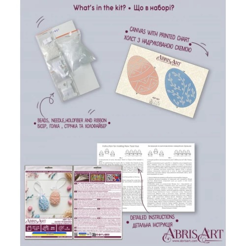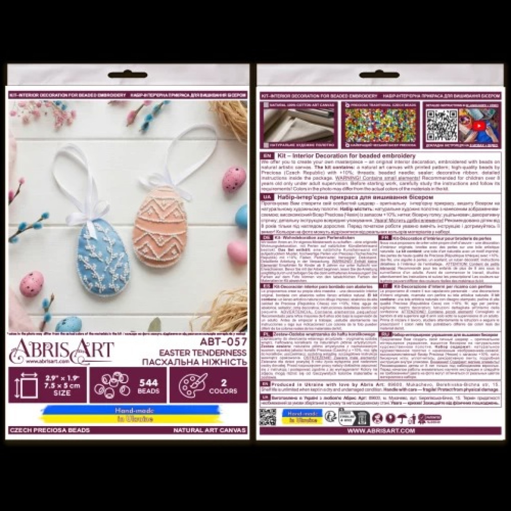 ABT-057 Пасхальна ніжність від Абрис Арт — набір для створення інтер’єрної прикраси з вишиванням бісером на натуральному художньому холсті з нанесеним зображенням-схемою. У комплекті є збільшений відріз холста, більший за розмір готової роботи 5x15 см, щоб було зручно вишивати та оформлювати виріб. Набір укомплектований чеським бісером Preciosa Ornela, високоякісними бісерними голками та детальною інструкцією з ключем, що допомагає отримати акуратний результат.