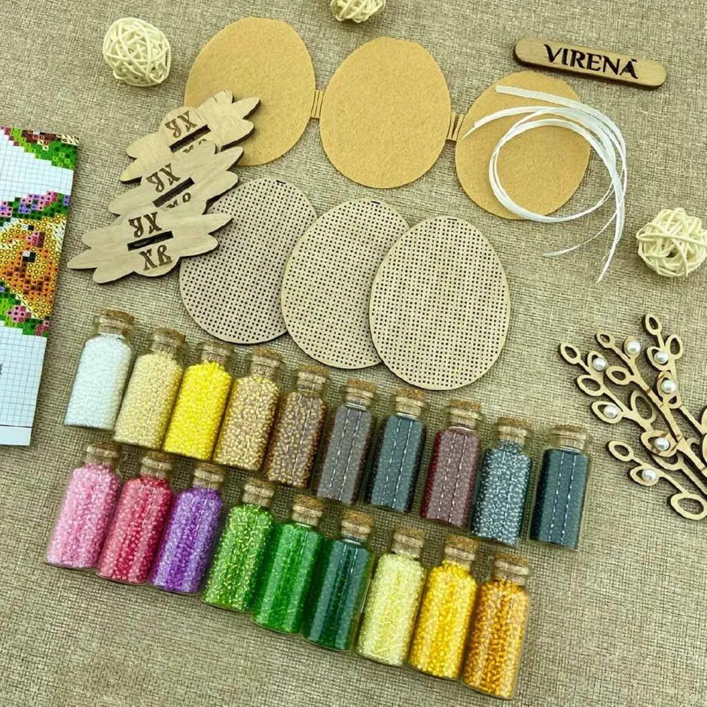 Набір Virena створений для вишивання великодніх міні-іграшок бісером на перфорованих дерев’яних заготовках. У комплекті є все необхідне для роботи та двостороннього оформлення: фігурний фетр для задньої сторони й стрічки для підвішування, а також бісер, голки та нитки для зручного процесу.